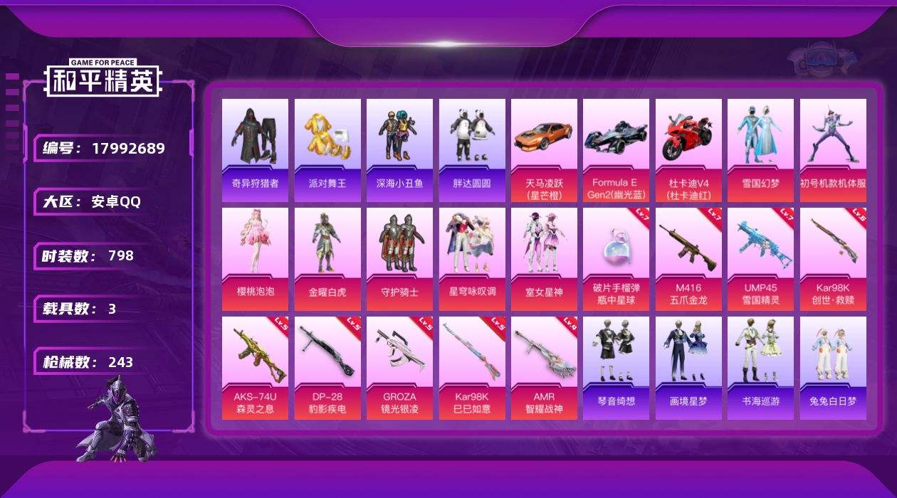 【605075】【不可二次】【安卓QQ】S686-奇异狩猎者 雪国梦幻 M416-五爪金龙 金曜白虎 漫步者 M24-奇异狩猎者 至尊龙雀飞行服 极速红龙 忍者信条 M762-奇异狩猎者 UMP4雪国精灵 仓鼠灰灰 M416-仓鼠灰灰 深海小丑鱼 浪漫天命 梦幻火箭飞行器 胖达圆圆 AKM-奇异狩猎者 Formula E Gen2(蓝) 奇异狩猎者 黑色刀锋 UMP45-雪国精灵 雪国幻梦 守护