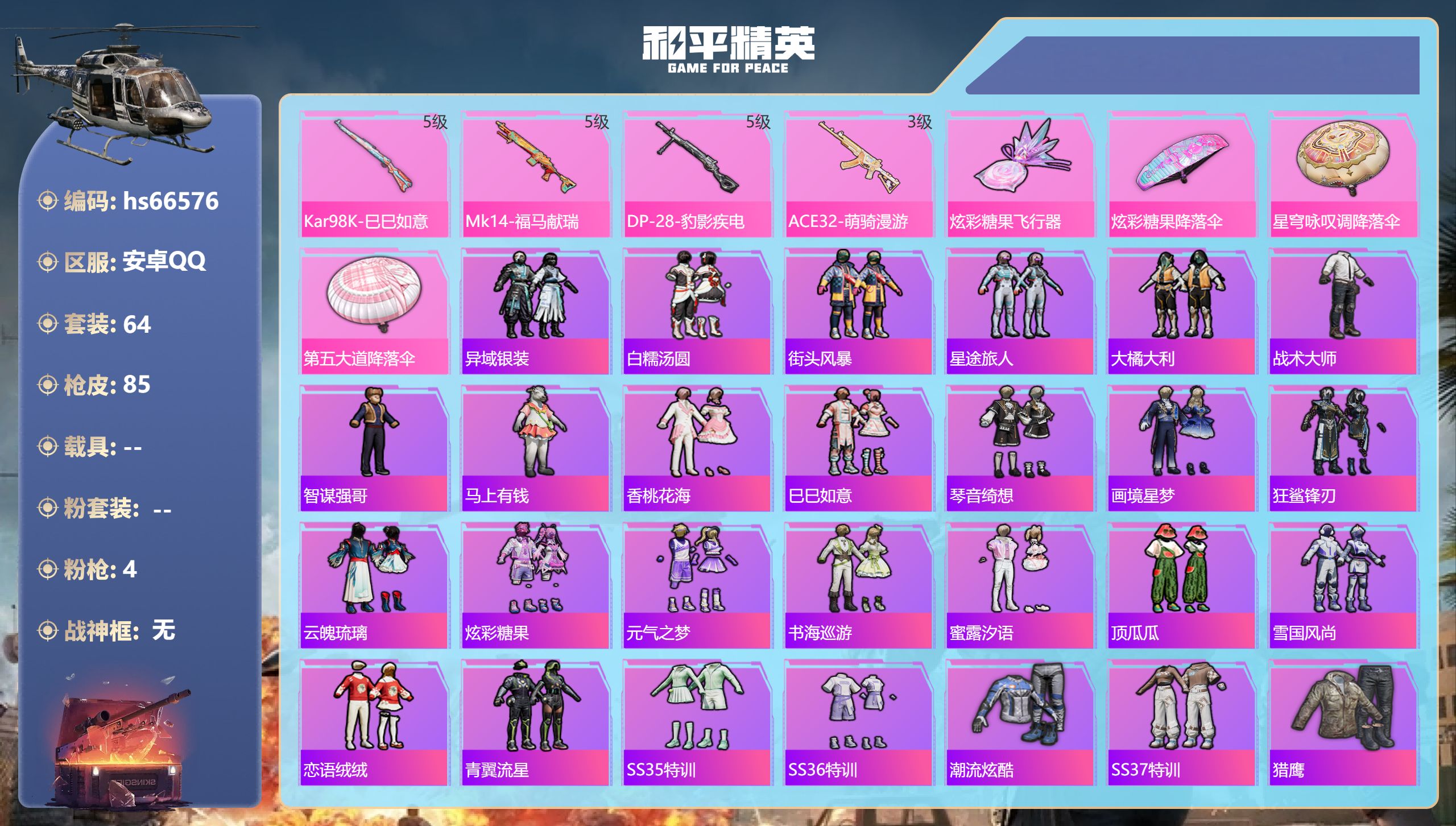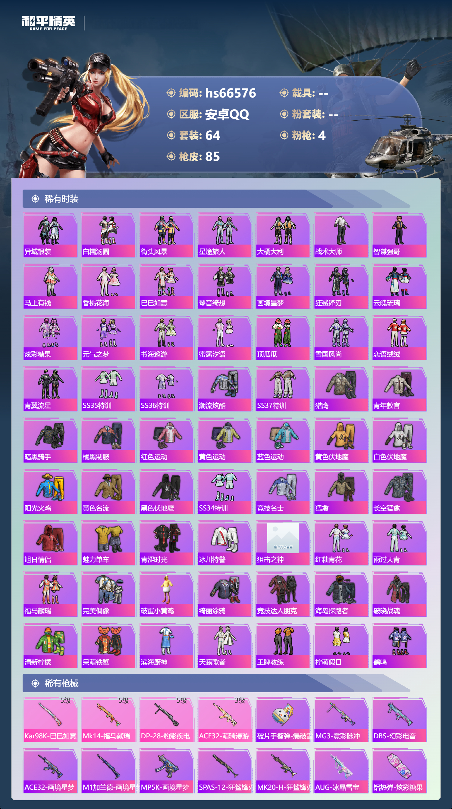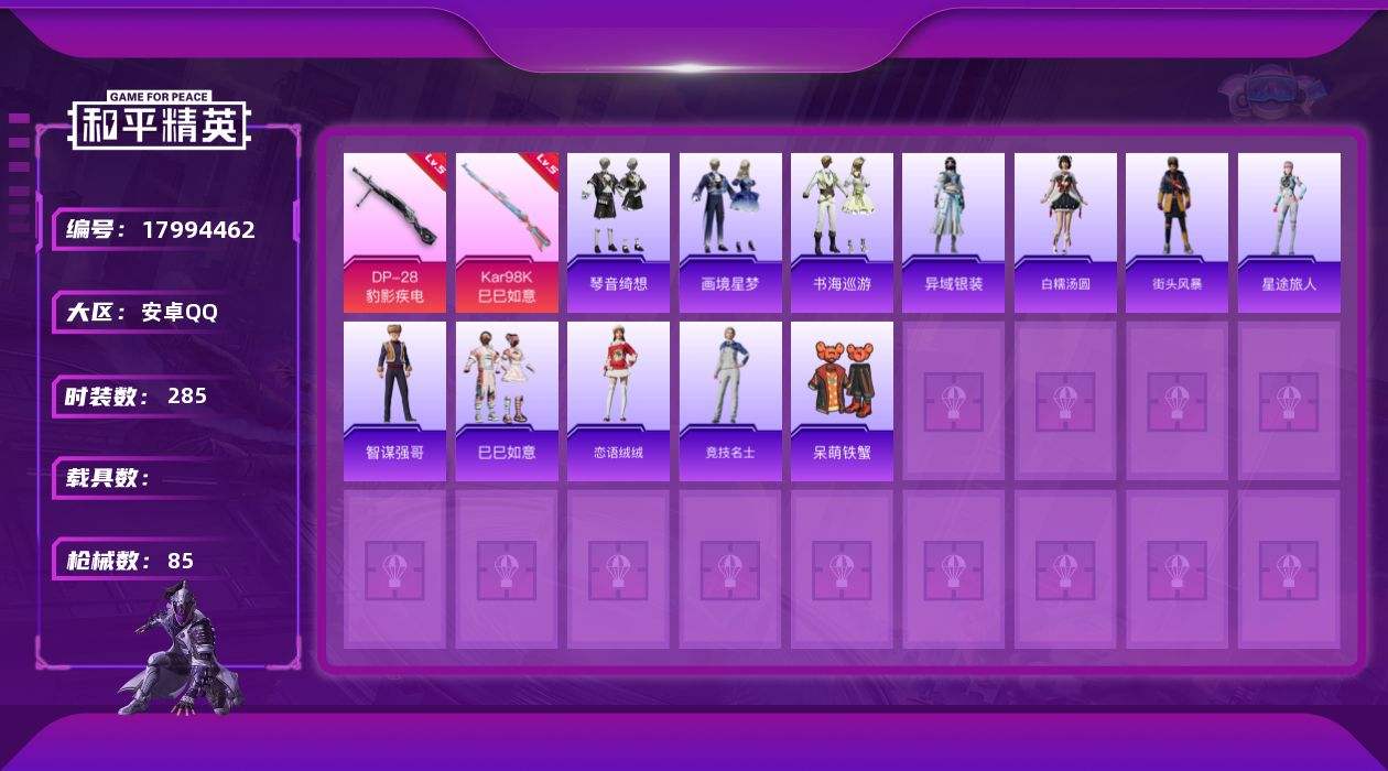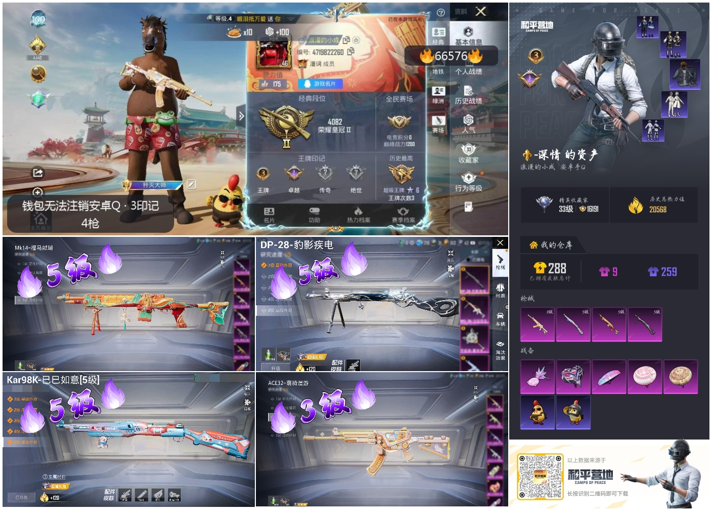 【605322】[17994462]【特价出售】钱包无法注销安卓Q-4特效枪2热门64套装85枪皮 20568热力值 3印记 历史超级王牌6星 【4特效枪】 Kar98K-巳巳如意 (5级) DP-28-豹影疾电 (5级) Mk14-福马献瑞 (5级) ACE32-萌骑漫游 (3级) 【2热门】 呆萌铁蟹 破蛋小黄鸡