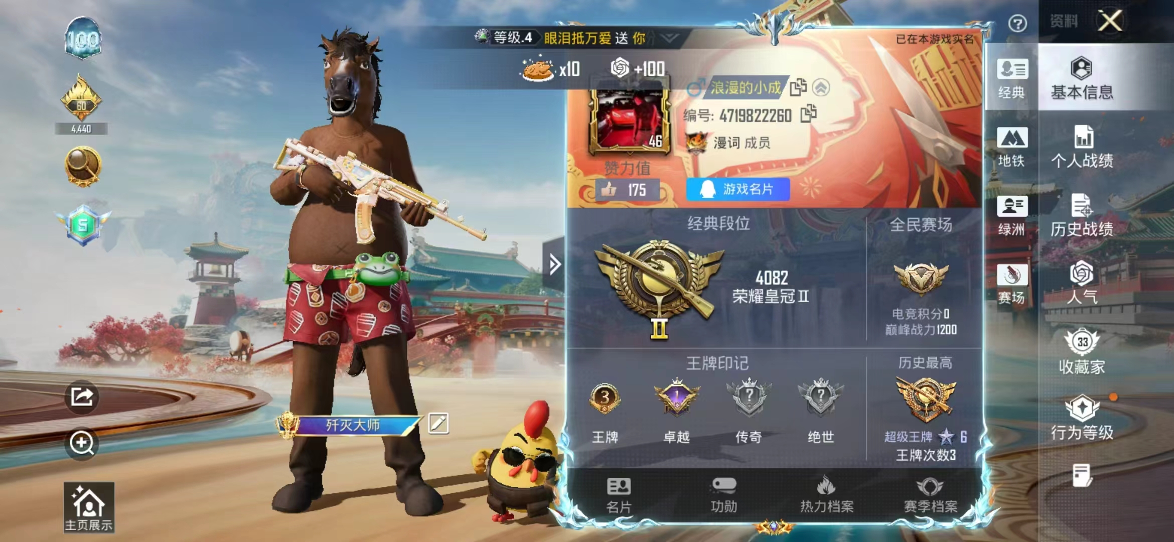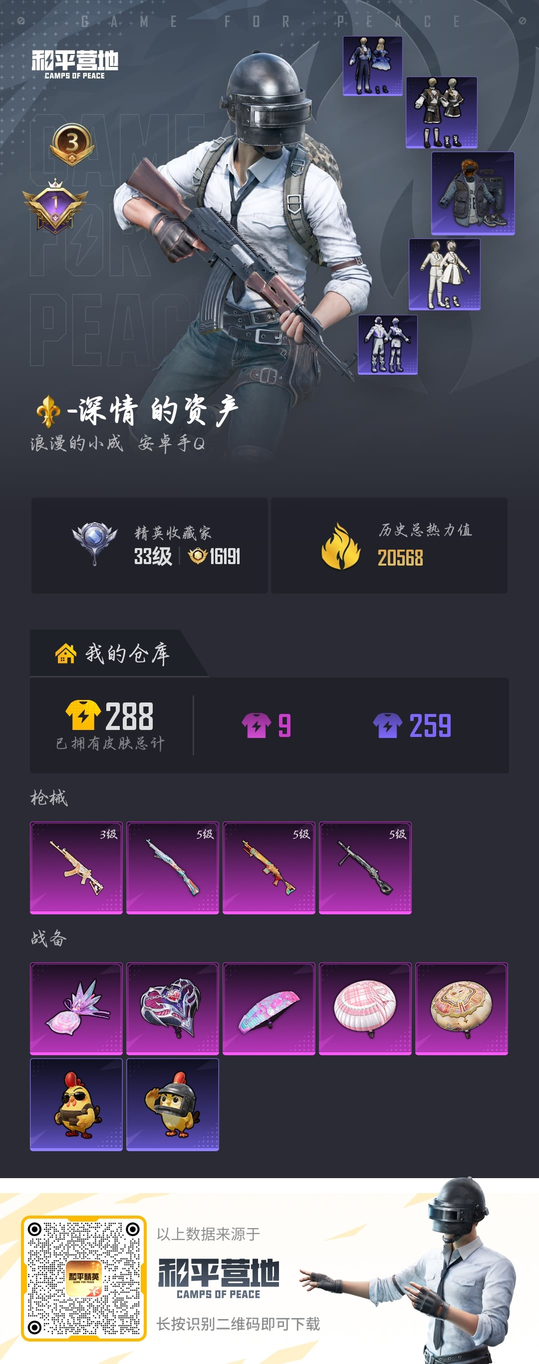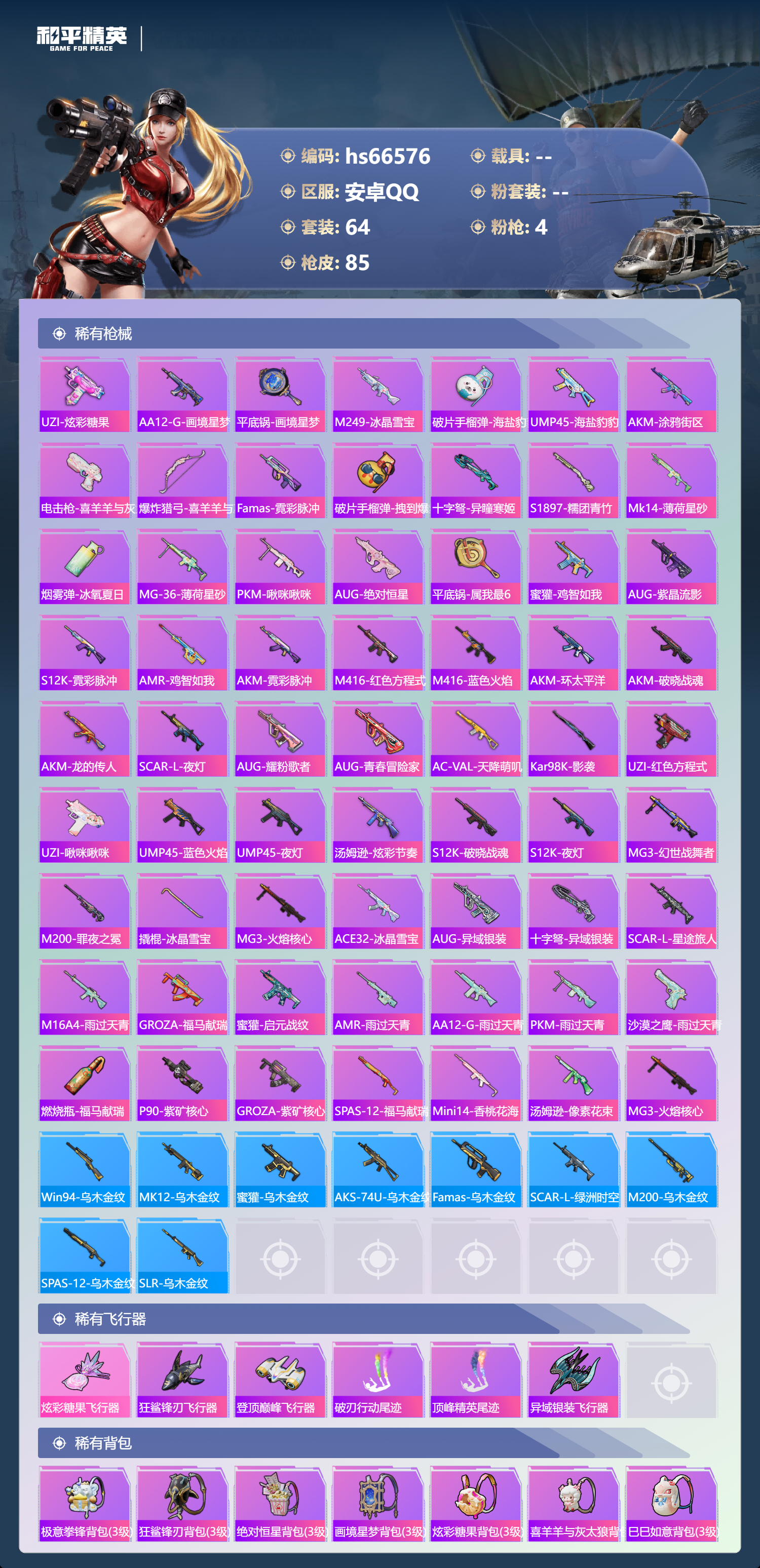 【605322】[17994462]【特价出售】钱包无法注销安卓Q-4特效枪2热门64套装85枪皮 20568热力值 3印记 历史超级王牌6星 【4特效枪】 Kar98K-巳巳如意 (5级) DP-28-豹影疾电 (5级) Mk14-福马献瑞 (5级) ACE32-萌骑漫游 (3级) 【2热门】 呆萌铁蟹 破蛋小黄鸡