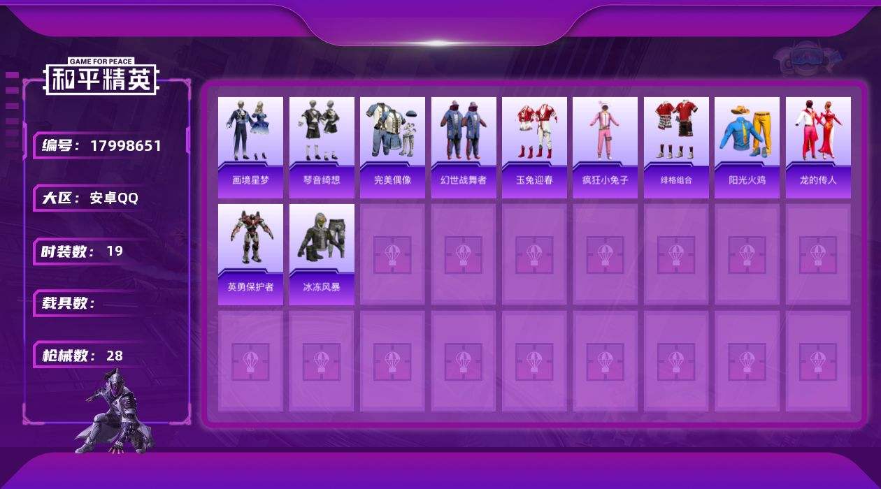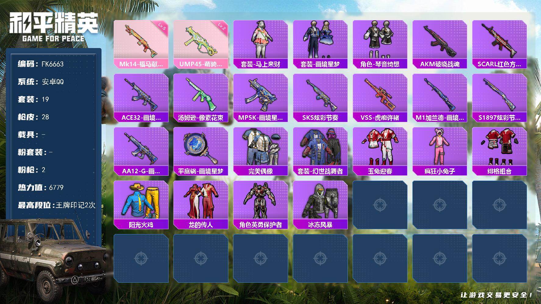 【605877】[17998651]【FK6663】19套装/枪械2/装备37/战备26/王牌印记2/热力值6779/二级UMP45-萌骑冒险/五级Mk14-福马献瑞/UMP45-萌骑冒险/Mk14-福马献瑞/套装-雪国风尚/套装-马上来财/画境星梦/琴音绮想/AKM-破晓战魂/SCAR-L-红色方程式/ACE32-画境星梦/汤姆逊-像素花束/MP5K-画境星梦/SKS-炫彩节奏/VSS-虎痴许