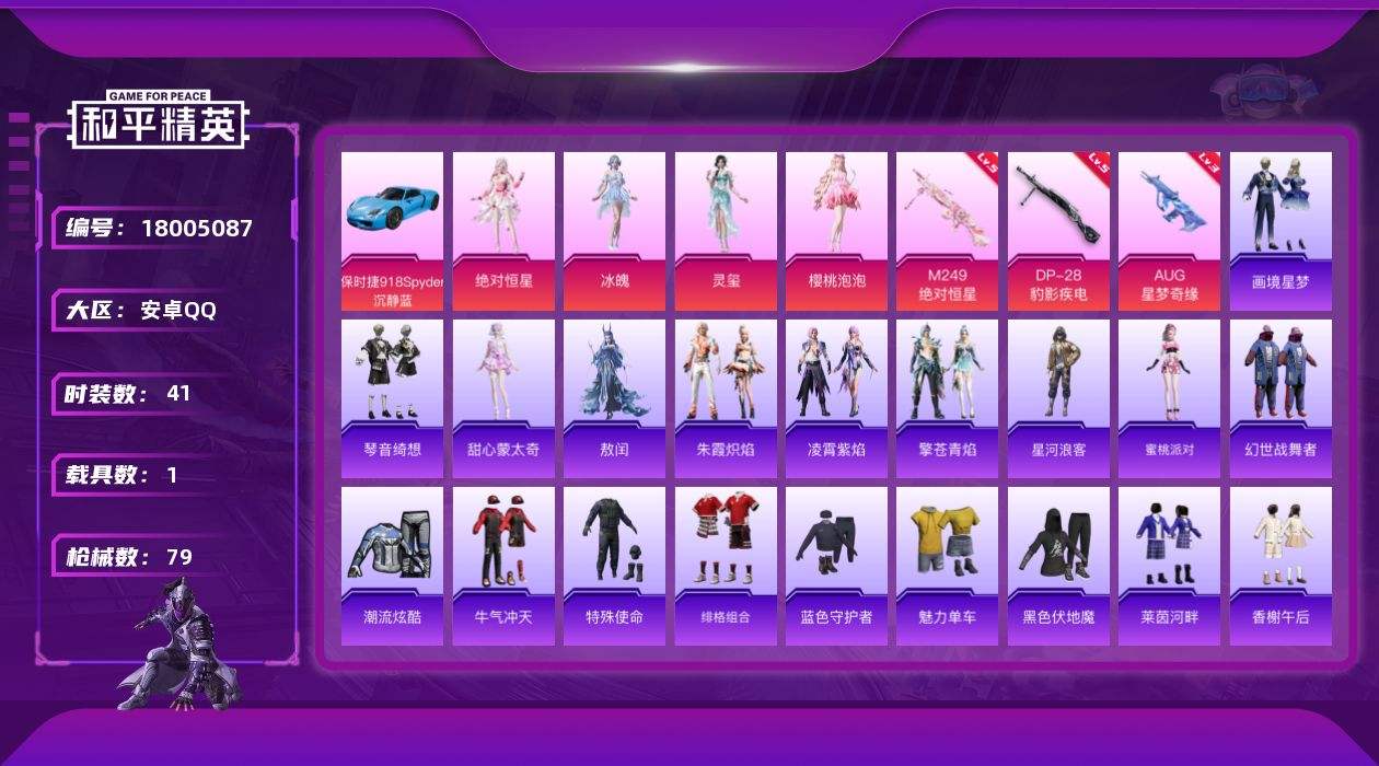 【606613】[18005087]安卓 手Q-5粉装-4特效枪-1载具-2粉色飞行器-24158热力值-0王牌印记-41套装-79枪皮【热门品类】:套装-星河浪客【粉色套装】:角色-绝对恒星,角色-樱桃泡泡,角色-冰魄,角色-灵玺,角色-旋星之夜【粉色枪皮等级】:AUG-星梦奇缘(三级),Mk14-福马献瑞(一级),M249-绝对恒星(五级),DP-28-豹影疾电(五级)【粉色载具】:保时捷9