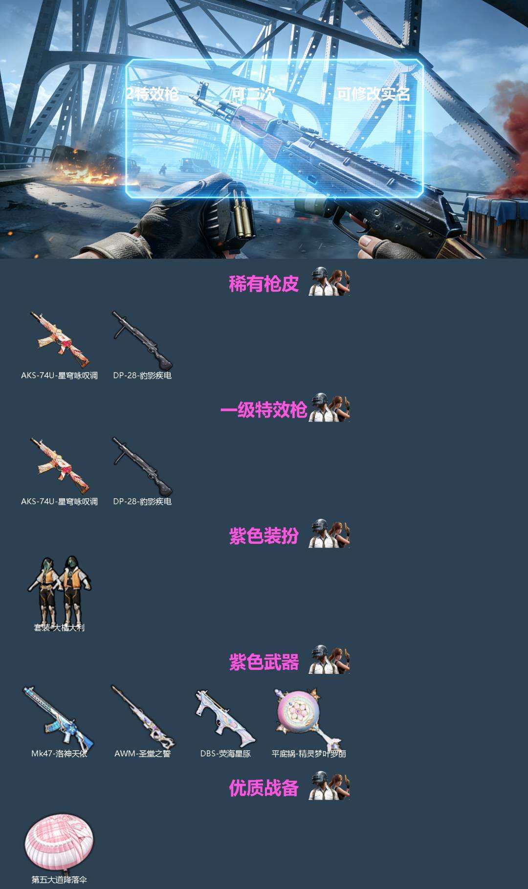 【608414】[18017099]2特效枪 可二次 可修改实名 【稀有枪皮】AKS-74U-星穹咏叹调,DP-28-豹影疾电 【一级特效枪】一级AKS-74U-星穹咏叹调,一级DP-28-豹影疾电 【紫色装扮】大橘大利 【优质战备】第五大道降落伞