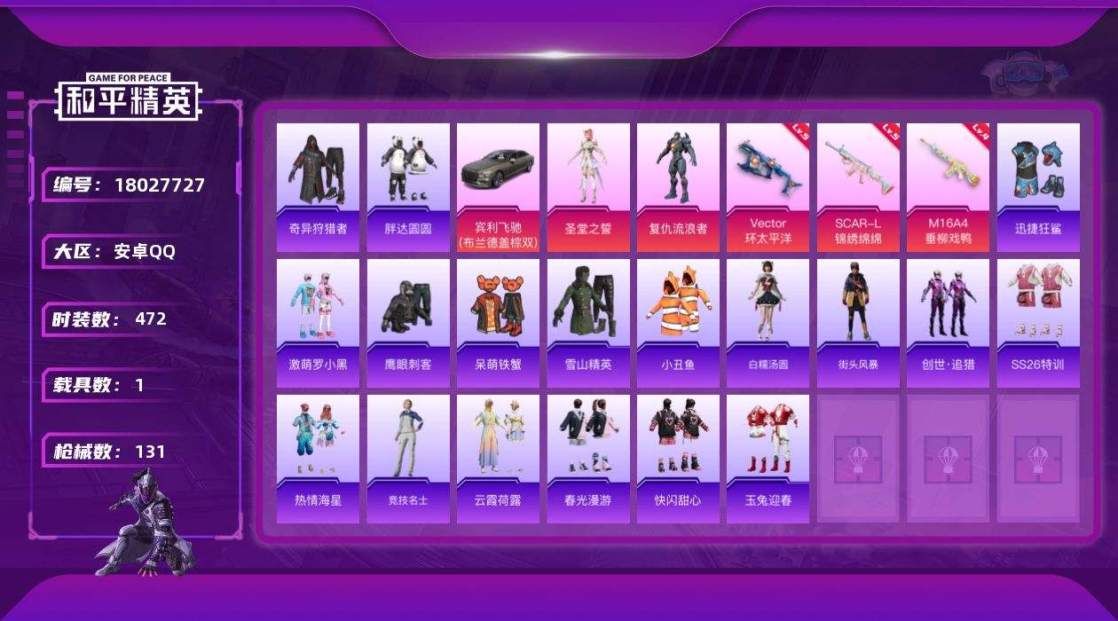 【609835】【不可二次】【安卓QQ】SCAR-L-锦绣绵绵 M16A4-垂柳戏鸭 M416-仓鼠灰灰 迅捷狂鲨 奇异狩猎者 M24-奇异狩猎者 Vector-环太平洋 雪山精英 M762-风花雪月 激萌罗小黑 胖达圆圆