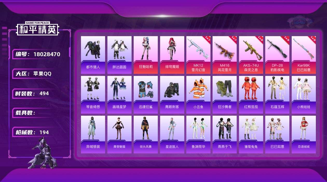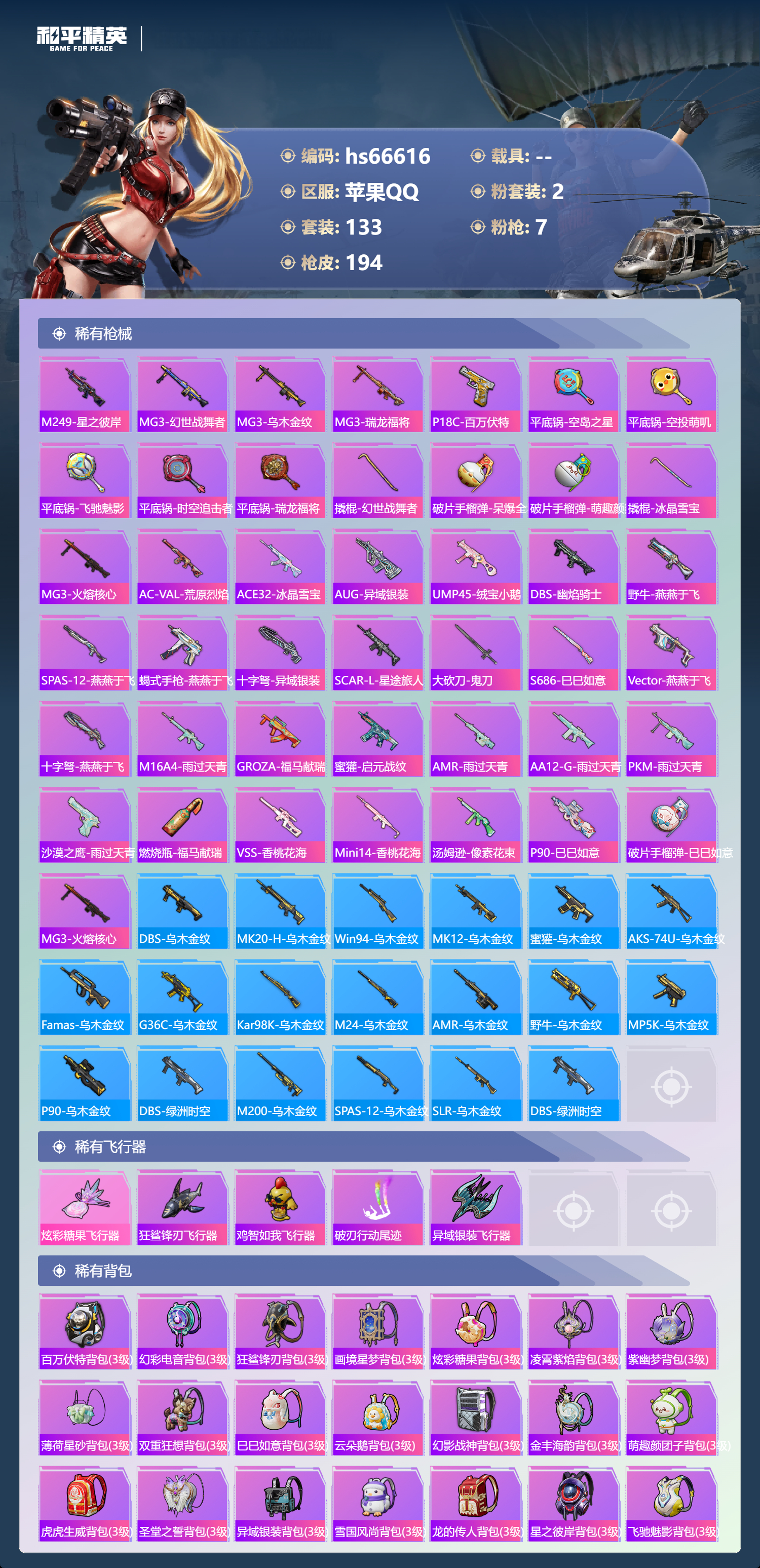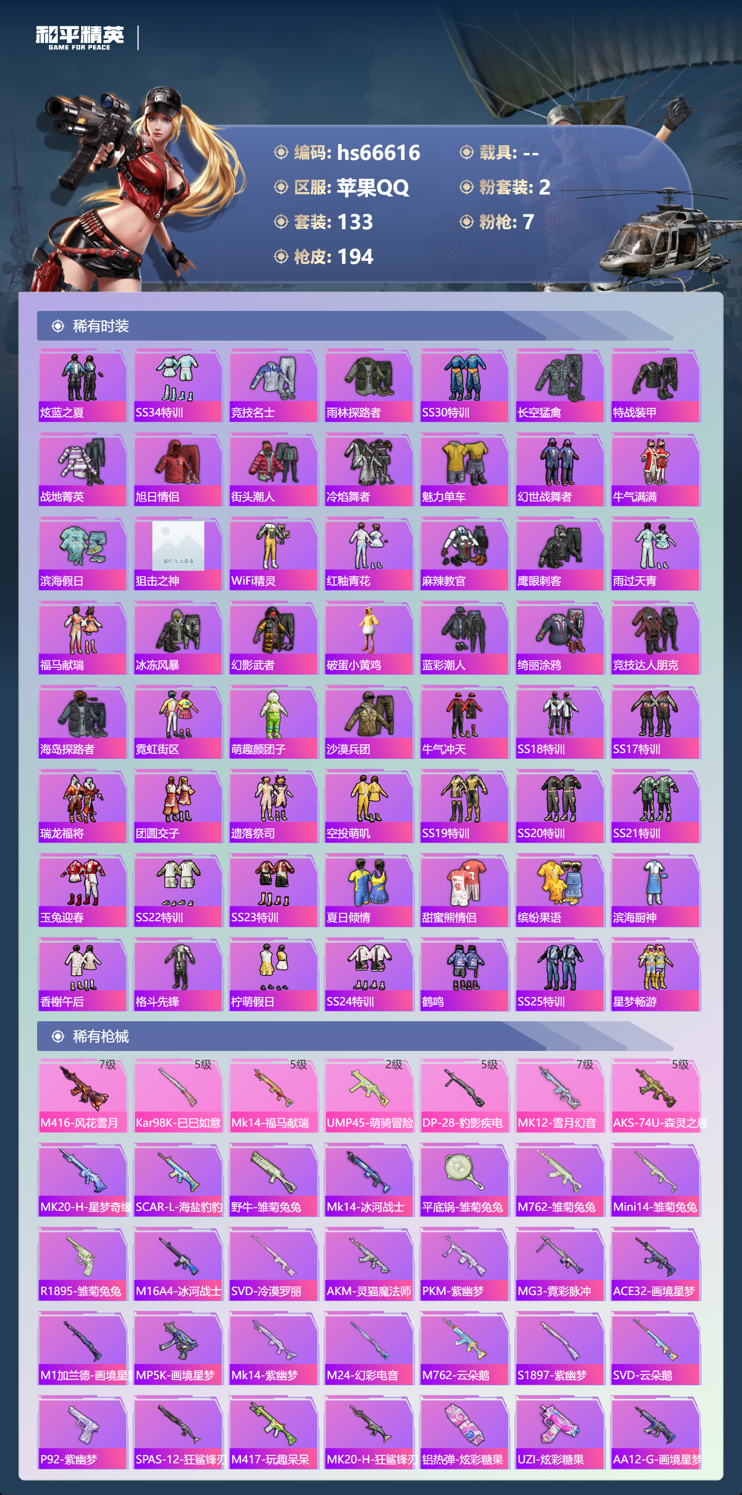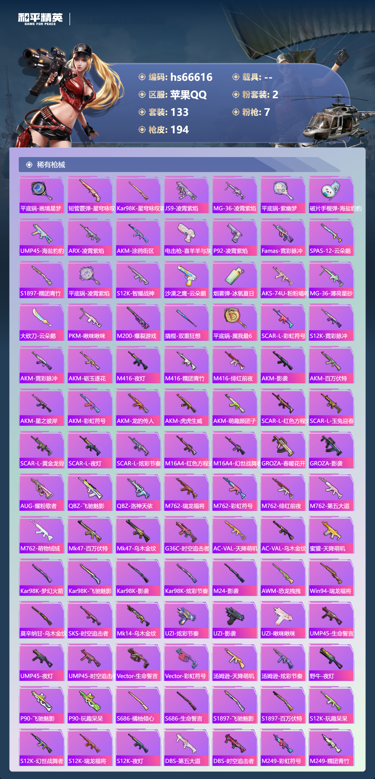 【609978】【不可二次】【苹果QQ】龟仙人 红熊茄茄 漫步者 都市猎人 迅捷狂鲨 M762-瑞龙福将 狂沙舞者 M416-风花雪月 AKM-百万伏特 瑞龙福将 醒狮腾龙 胖达圆圆 团圆交子