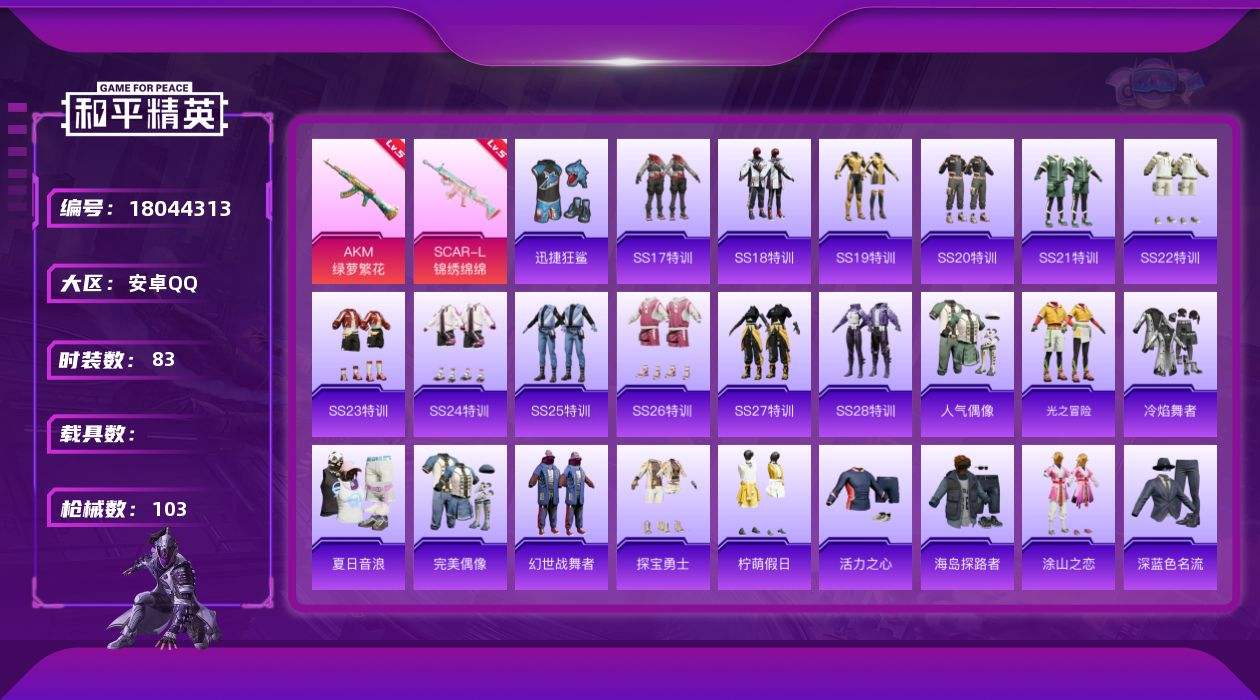 【611710】[18044313]安卓【小号 AKM-绿萝繁花/SCAR-L-锦绣绵绵/套装-SS17特训/套装-涂山之恋/橘柚倾心降落伞】 手Q-0粉装-2特效枪-0载具-0粉色飞行器-28654热力值-4王牌印记-83套装-103枪皮【粉色枪皮等级】:AKM-绿萝繁花(五级),SCAR-L-锦绣绵绵(五级)【粉色枪皮】:AKM-绿萝繁花,SCAR-L-锦绣绵绵【粉色降落伞】:橘柚倾心降落伞