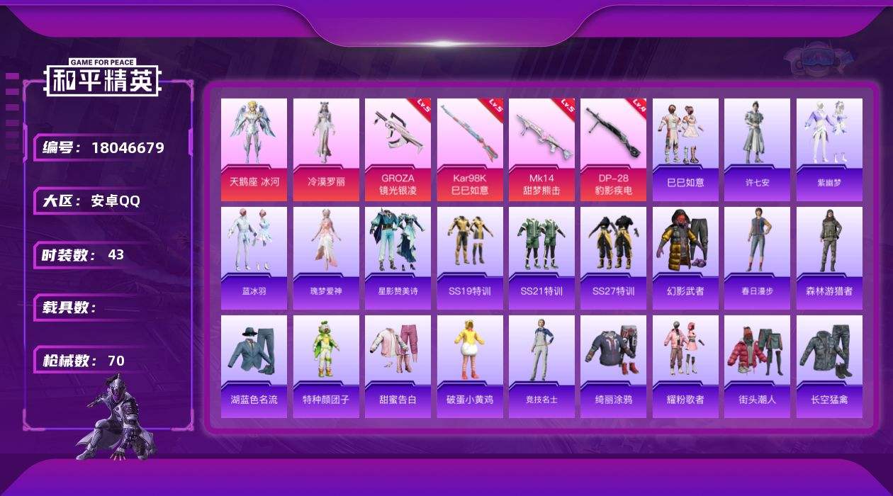 【611919】[18046679]安卓 手Q-2粉装-5特效枪-0载具-1粉色飞行器-20822热力值-1王牌印记-43套装-70枪皮【粉色套装】:角色-天鹅座 冰河,角色-冷漠罗丽【粉色枪皮等级】:GROZA-镜光银凌(五级),Kar98K-巳巳如意(五级),Mk14-甜梦熊击(五级),DP-28-豹影疾电(四级),PKM-萌骑夺宝(二级)【粉色枪皮】:GROZA-镜光银凌,Kar98K-巳