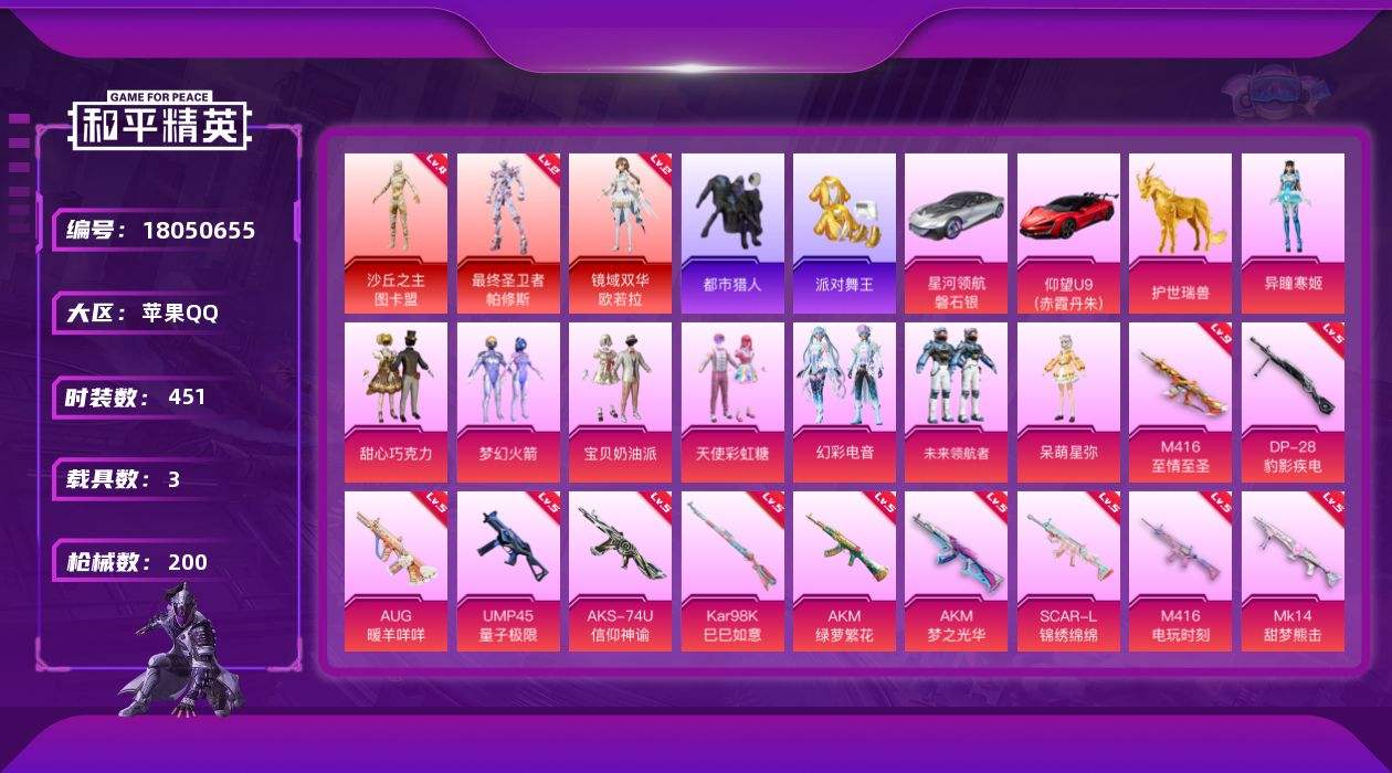 【613000】【可二次】【苹果QQ】AKM-绿萝繁花 漫步者 P90-沙丘之主 都市猎人 仰望U9(赤霞丹朱) 忍者信条 镜域双华-欧若拉 M416-电玩时刻 沙丘之主-图卡盟 M416-至情至圣 星河领航(磐石银) UMP45-量子极限 M24-镜域双华 迅捷狂鲨 UMP45-宇宙意志 甜心巧克力 SCAR-L-锦绣绵绵 M416-风花雪月 梦幻火箭 AKM-梦之光华 天使彩虹糖 SCAR-