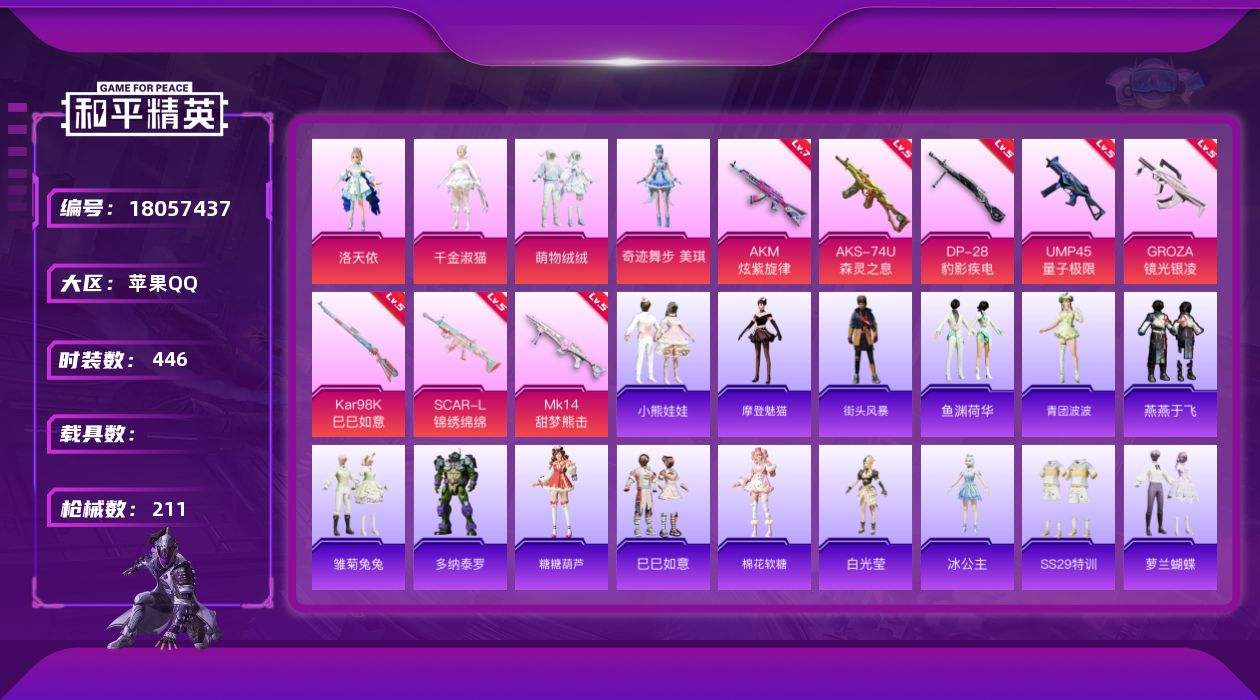 【614021】【不可二次】【苹果QQ】SCAR-L-锦绣绵绵 龟仙人 AKM-炫紫旋律 UMP45-量子极限 漫步者 MK47-林间仙鹿 M762-瑞龙福将 瑞龙福将 洛天依 镜光幻境飞行翼 团圆交子