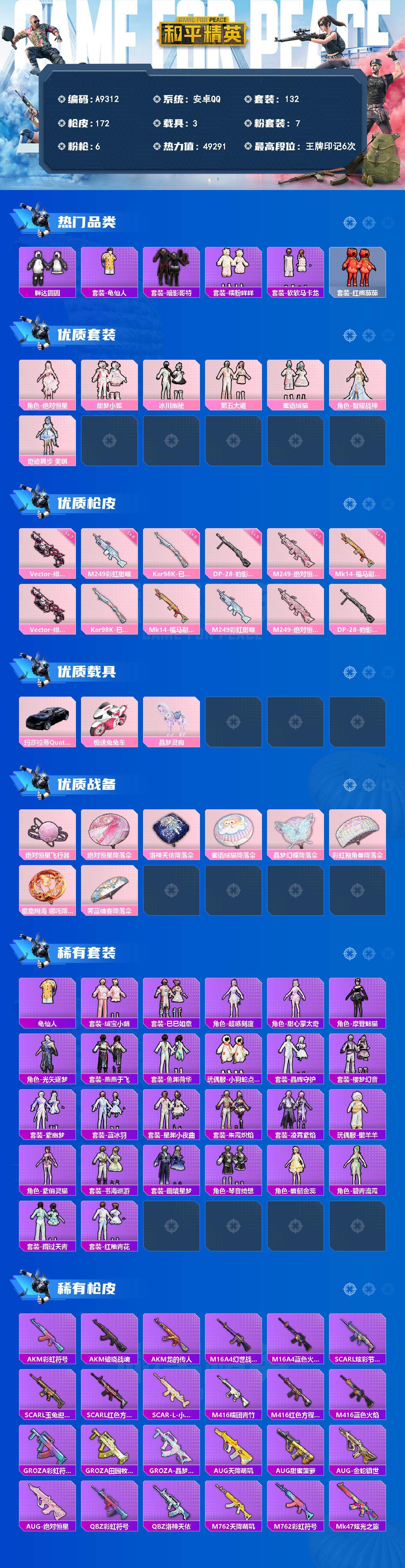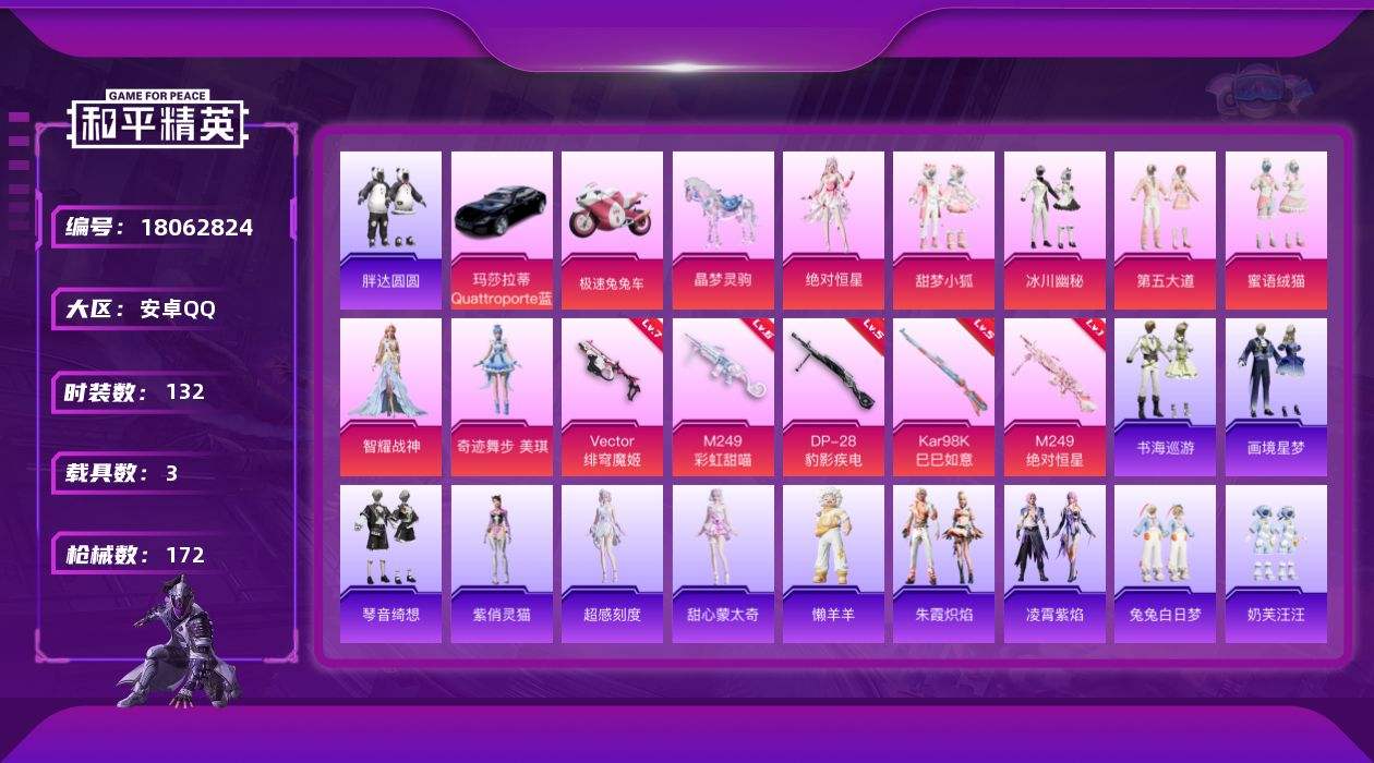 【614753】[18062824]安卓【公主号 套装-胖达圆圆,套装-暗影哥特,套装-糯粉咩咩,套装-红熊茄茄,Vector-绯穹魔姬(七级),Kar98K-巳巳如意(五级),玛莎拉蒂Quattroporte(夜幕蓝),极速兔兔车,晶梦灵驹】 手Q-7粉装-6特效枪-3载具-1粉色飞行器-49291热力值-6王牌印记-132套装-172枪皮【热门品类】:套装-胖达圆圆,套装-龟仙人,套装-暗影
