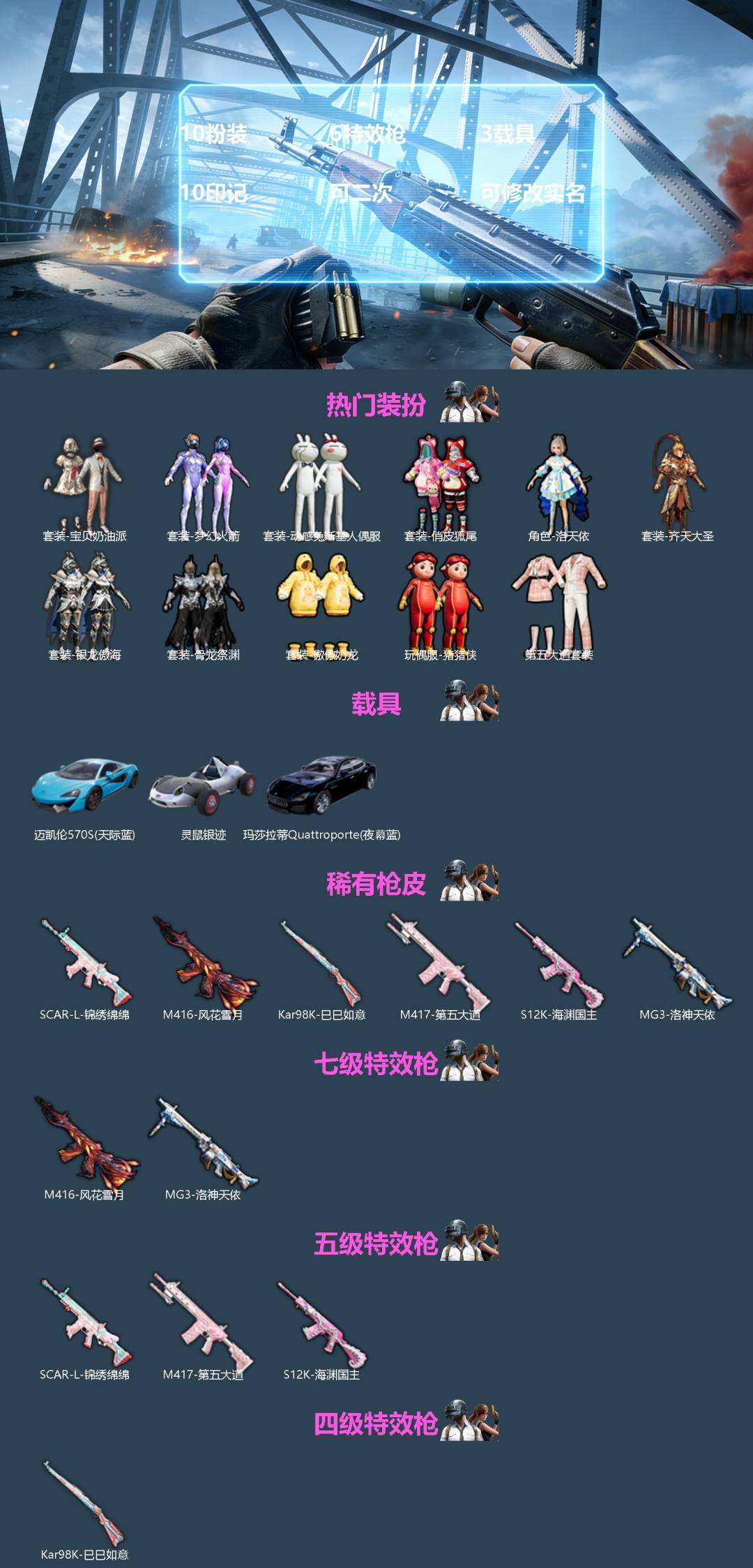 【616170】【可二次】【苹果QQ】龟仙人 齐天大圣降落伞 梦幻火箭降落伞 灵鼠银迹 洛天依 瑞龙福将 浪漫天命 骨龙祭渊 梦幻火箭飞行器 旋转彩虹降落伞 猪猪侠 未来战士降落伞 团圆交子 红熊茄茄 S12K-海渊国主 暗夜契约 林间仙鹿降落伞 MG3-洛神天依 M417射手步枪 迈凯伦570S 天际蓝 银龙傲海 齐天大圣 M416-风花雪月 梦幻火箭 狂战萌兔 镜域双华-灵镜之阶 宝贝奶油派