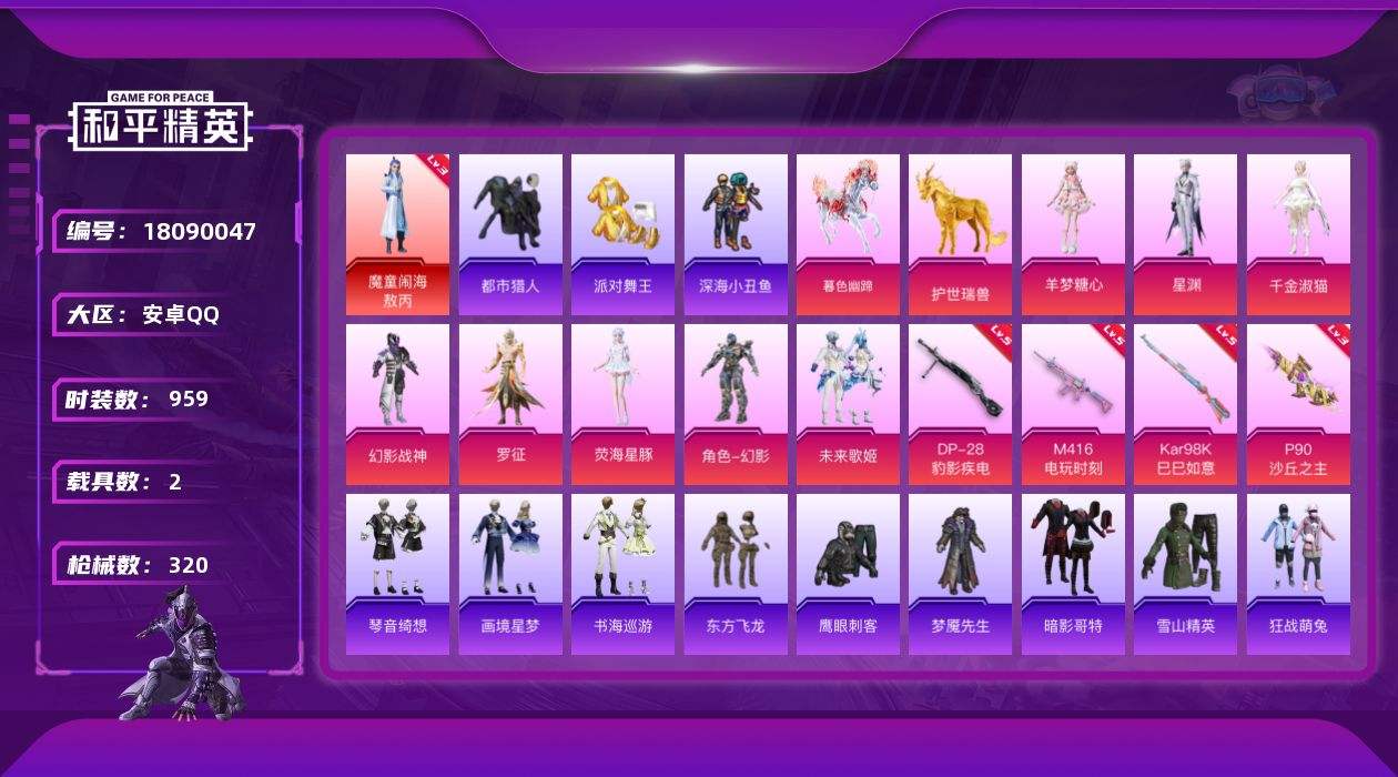 【618223】【不可二次】【安卓QQ】龟仙人 魔童闹海-敖丙 水银刺客 漫步者 P90-沙丘之主 都市猎人 东方飞龙 星之彼岸飞行器 西部牛仔 极速红龙 M416-南瓜骑士 M762-奇异狩猎者 M416-电玩时刻 娴静芝兰 太空嘟嘟飞行器 浪漫假日 深海小丑鱼 瑞龙福将 团圆交子 M762-瑞龙福将 AKM-缤纷海域 AUG-魔法学院 幻影战神 派对舞王 绝色倾城飞行器 暗影哥特 雪山精英