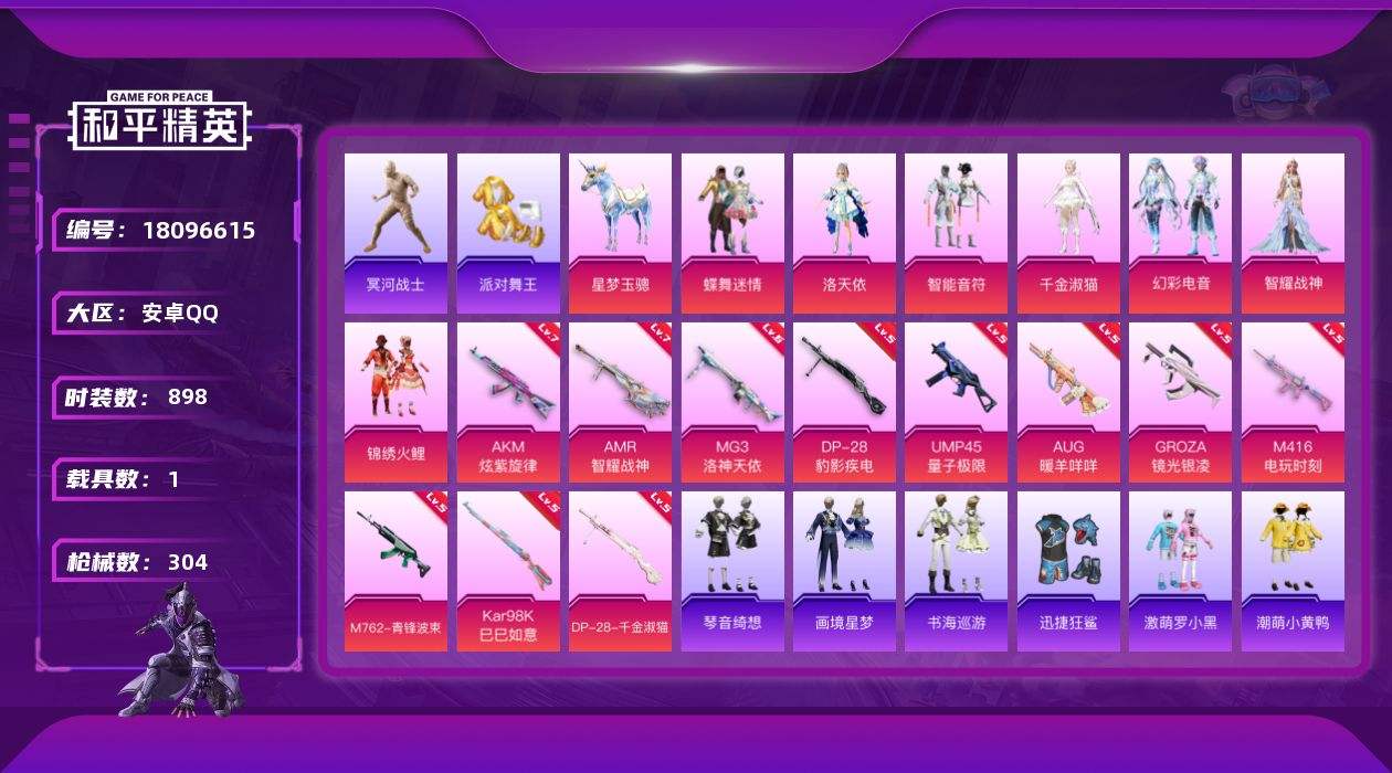 【619136】【不可二次】【安卓QQ】龟仙人 木乃伊 M762-青锋波束 洛天依 忍者信条 M762-奇异狩猎者 M416-电玩时刻 UMP45-量子极限 智能音符 激萌小黄鸭 蝶舞迷情 浪漫天命 梦之呓语 激萌罗小黑 锦绣火鲤 星梦玉骢 伏魔团飞行器 迅捷狂鲨 潮萌小黄鸭 黑色刀锋 MG3-洛神天依 狂沙舞者 金羽特工 AKM-炫紫旋律 童话森林 派对舞王 风华少年志 暗影哥特 雪山精英