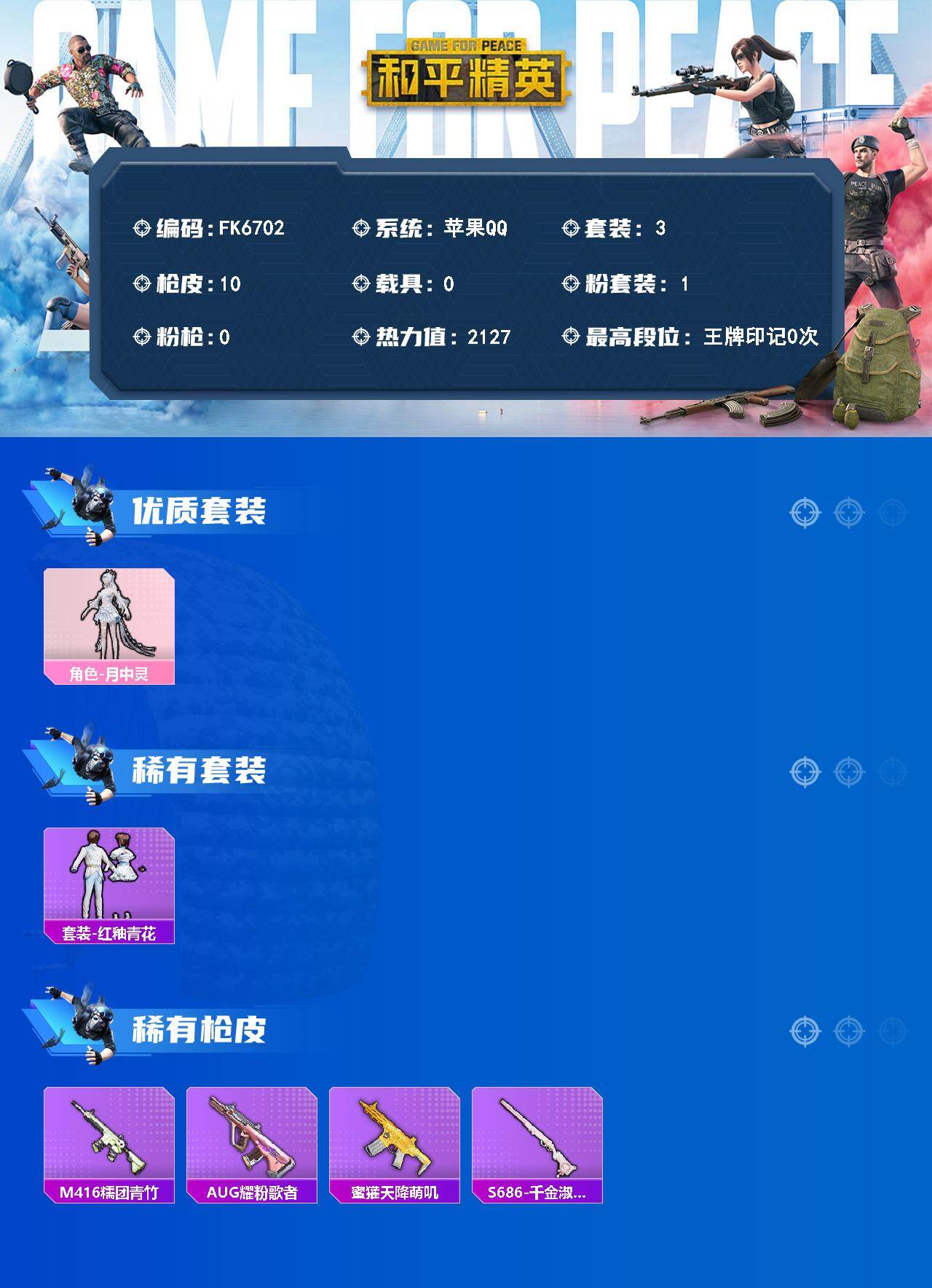 【620124】[18102393]【FK6702】3套装/装备10/战备14/热力值2127/角色-月中灵/套装-红釉青花/M416-糯团青竹/AUG-耀粉歌者/蜜獾-天降萌叽/S686-千金淑猫