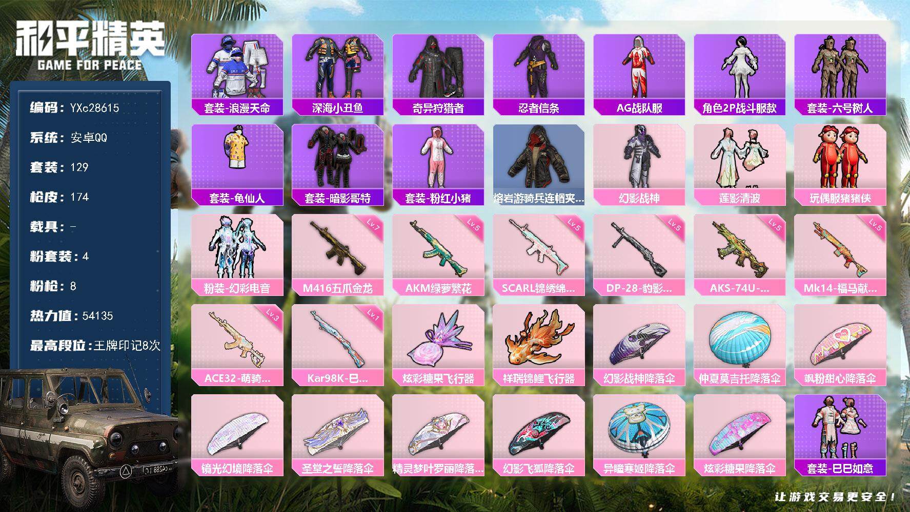 【620883】【可二次】【安卓QQ】龟仙人 AKM-绿萝繁花 仲夏莫吉托降落伞 M416-五爪金龙 漫步者 奇异狩猎者 幻影战神降落伞 忍者信条 SCAR-L-锦绣绵绵 粉红小猪 深海小丑鱼 六号树人 幻影战神 浪漫天命 暗影哥特 猪猪侠 激萌罗小黑