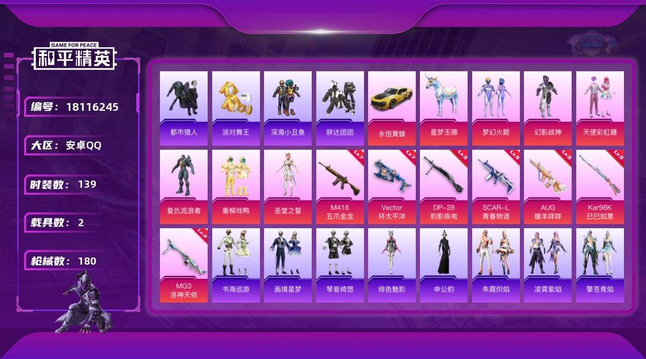 【621451】【不可二次】【安卓QQ】梦幻火箭 M416-五爪金龙 天使彩虹糖 深海小丑鱼 幻影战神 MG3-洛神天依 SCAR-L-青春物语