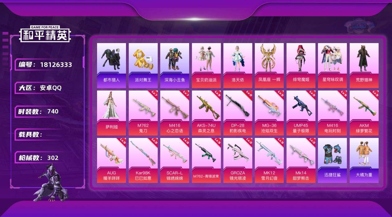【622984】【不可二次】【安卓QQ】龟仙人 AKM-绿萝繁花 大橘为重 M762-青锋波束 漫步者 拂晓神骑飞行器 都市猎人 迅捷狂鲨 洛天依 狂沙舞者 金羽特工 荒野猎神 M762-奇异狩猎者 M416-电玩时刻 SCAR-L-锦绣绵绵 UMP45-量子极限 M416-心之恋语 AKM-缤纷海域 浪漫假日 深海小丑鱼 宝贝奶油派 派对舞王 浪漫天命 暗影哥特