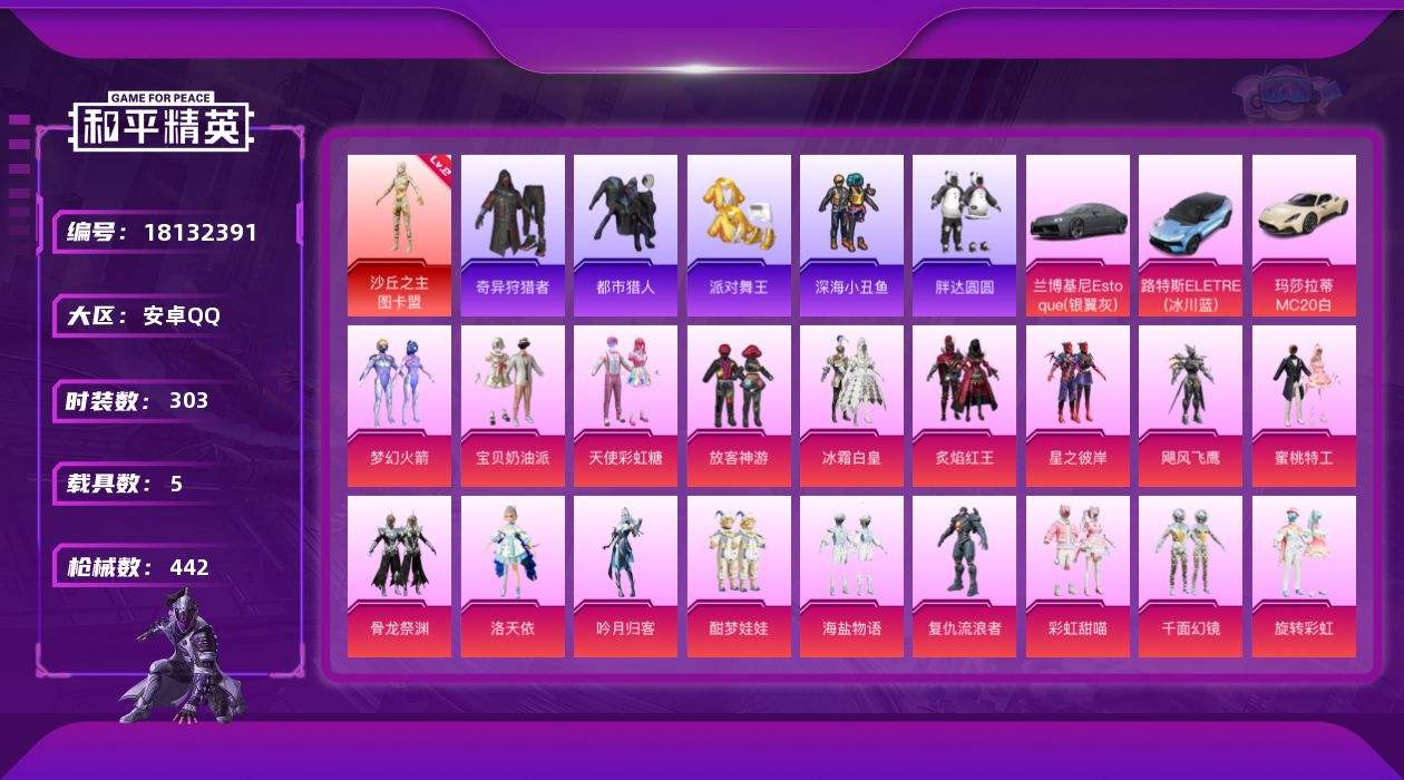 【623651】【不可二次】【安卓QQ】萌兔起飞 奇异狩猎者 酣梦娃娃 MG3-洛神天依 洛天依 兰博轿车灰色 放客神游 吟月归客 蜜桃特工 海盐物语 M416-风花雪月 梦幻火箭 AKM-梦之光华 天使彩虹糖 UMP45-相思残雪 深海小丑鱼 浪漫波比 宝贝奶油派 SCAR-童趣迷兔 AUG-星之彼岸 骨龙祭渊 SCAR-L-青春物语 98K-伏魔团