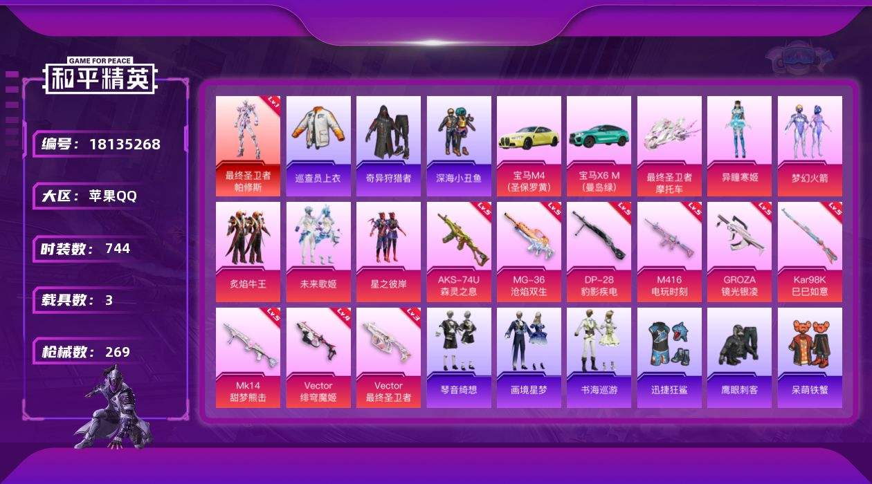 【624000】【可二次】【苹果QQ】龟仙人 漫步者 迅捷狂鲨 奇异狩猎者 M762-瑞龙福将 极速红龙 豚鼠丹丹 M416-电玩时刻 巡查衣 梦幻火箭 星之彼岸 AKM-缤纷海域 AKM-百万伏特 粉红小猪 深海小丑鱼 瑞龙福将 星夜魔法师飞行翼 最终圣卫者-帕修斯 团圆交子 AKM-奇异狩猎者