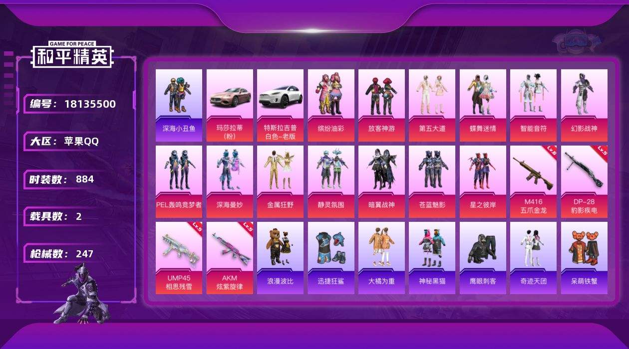 【624055】【可二次】【苹果QQ】灵绣 大橘为重 漫步者 苍蓝魅影 特斯拉X白色 金属狂野 忍者信条 M416-仓鼠灰灰 缤纷油彩 深海小丑鱼 浪漫波比 智能音符 AWM-激战未来 蝶舞迷情 AKM-奇异狩猎者 AKM-山经魅狐 迅捷狂鲨 M762-瑞龙福将 黑色刀锋 新侠客行 AKM-炫紫旋律 PEL轰鸣竞梦者飞行器 UMP45-相思残雪 M416-梨园星光 神秘黑猫 暗翼战神 S686-