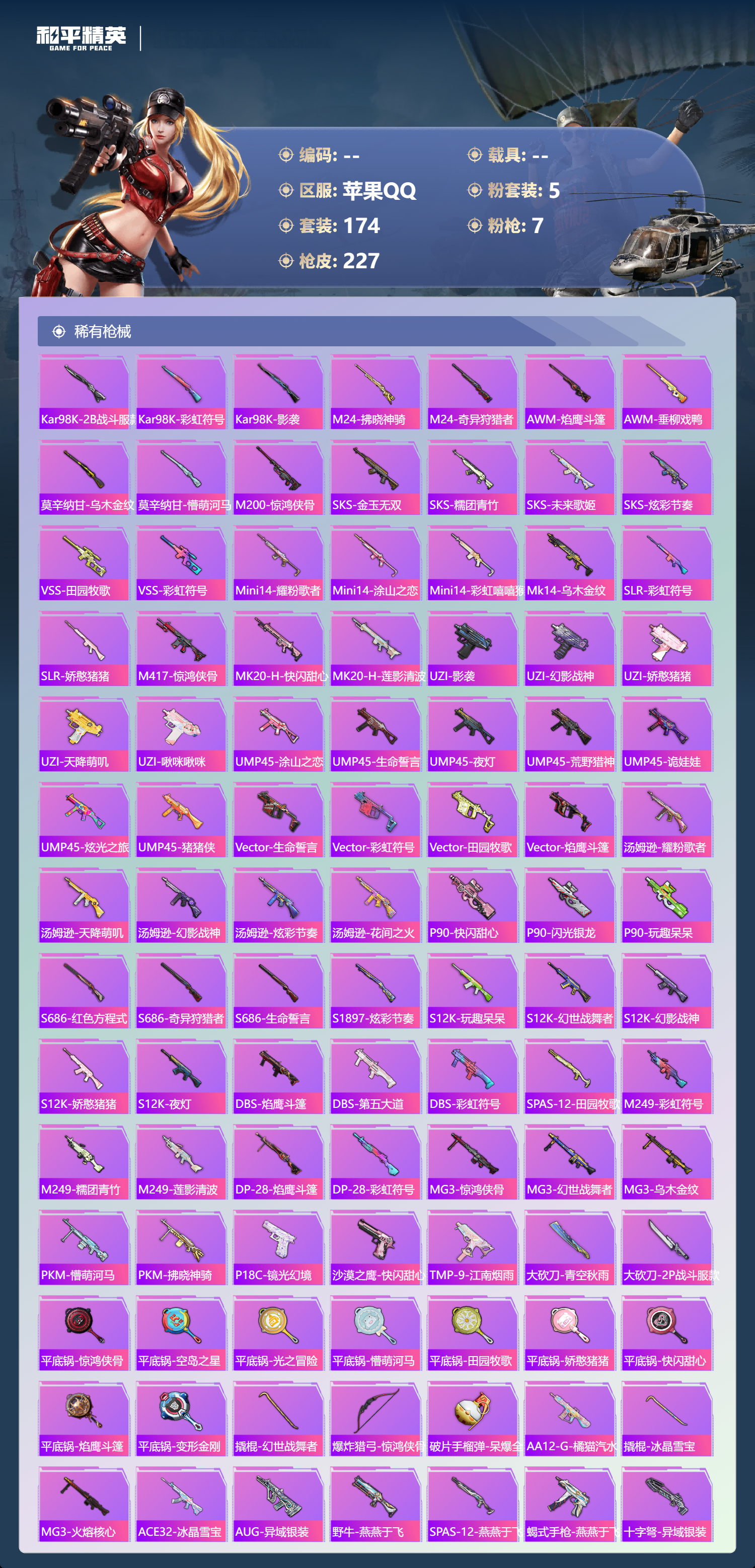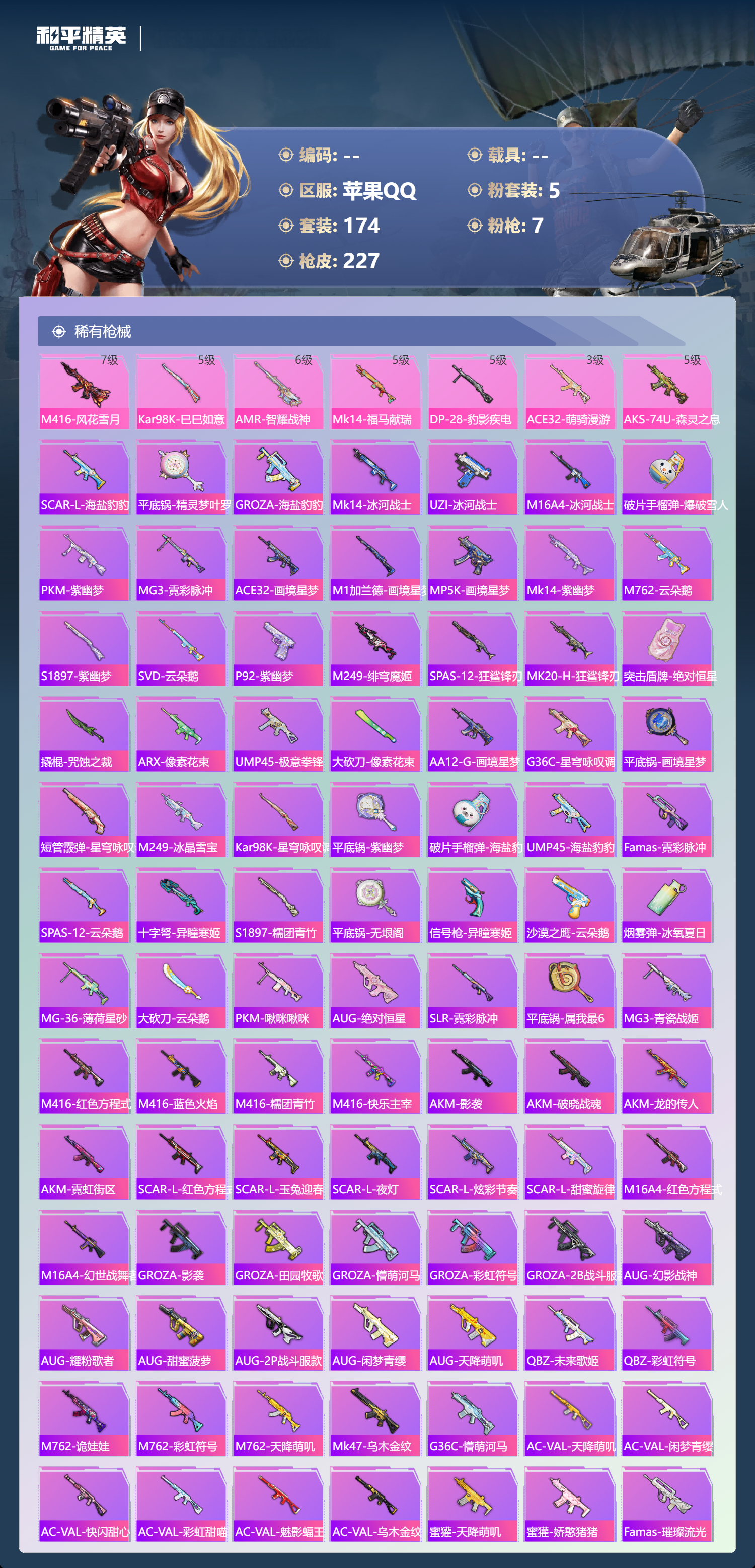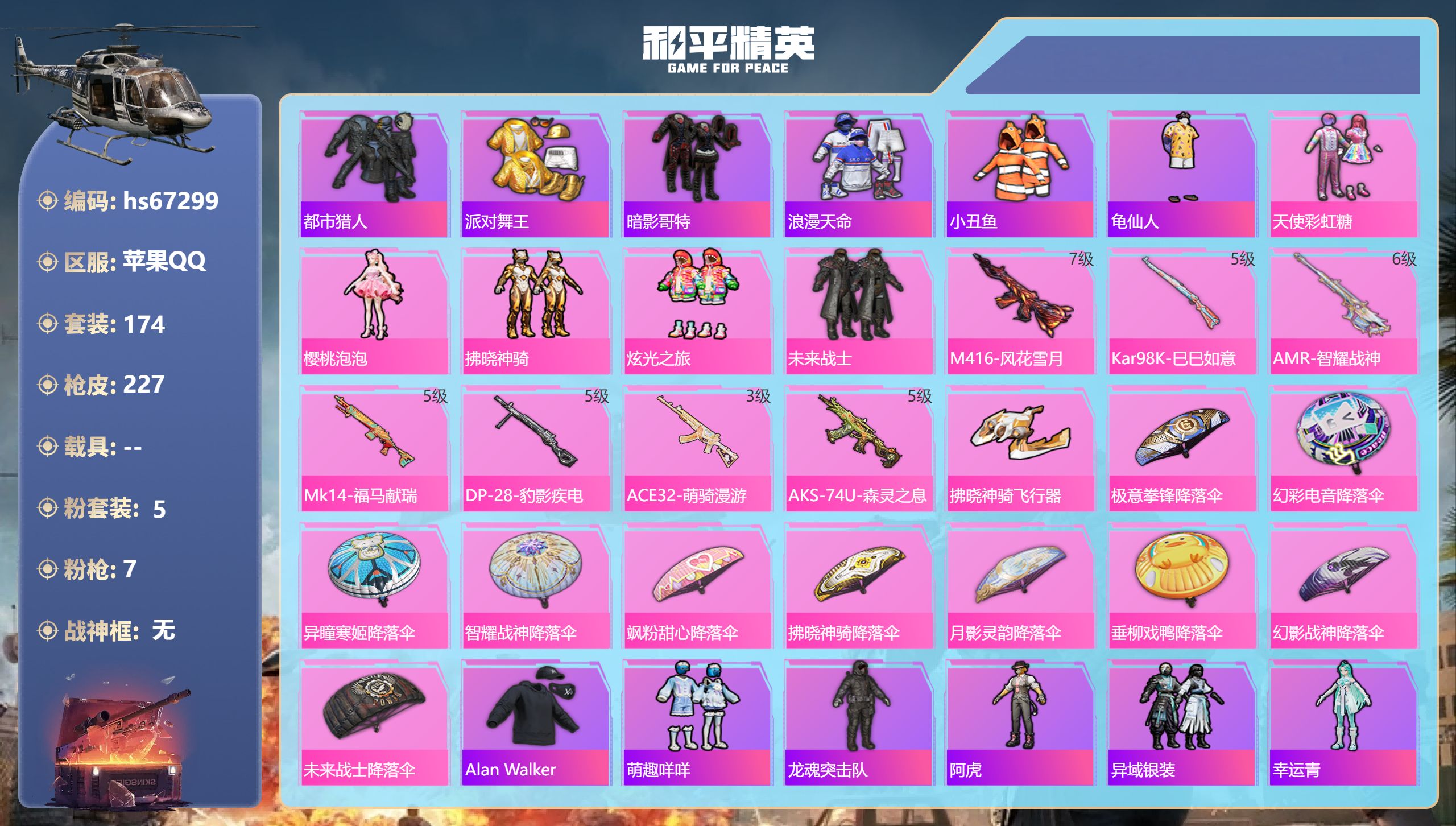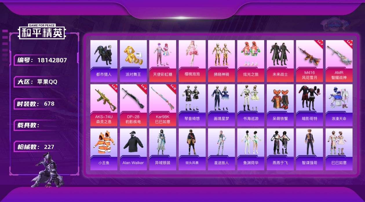 【625060】【可二次】【苹果QQ】龟仙人 S686-奇异狩猎者 漫步者 拂晓神骑飞行器 都市猎人 M24-奇异狩猎者 极速红龙 忍者信条 M416-风花雪月 M416-快乐主宰 天使彩虹糖 派对舞王 未来战士 浪漫天命 暗影哥特