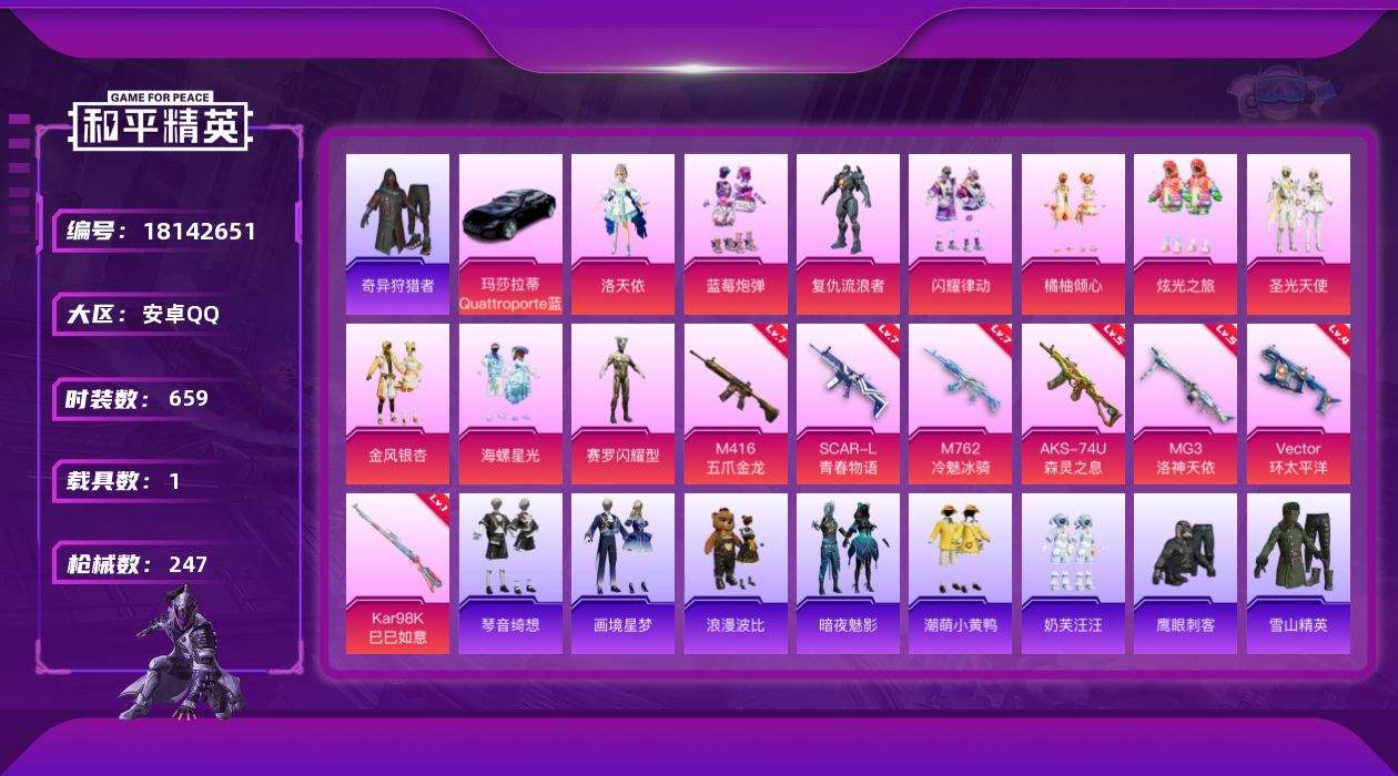 【625064】【不可二次】【安卓QQ】赛罗闪耀型 蓝莓炮弹 龟仙人 M416-五爪金龙 漫步者 洛天依 星之彼岸飞行器 忍者信条 庄周梦蝶飞行器 太空嘟嘟飞行器 浪漫假日 浪漫波比 瑞龙福将 激萌小黄鸭 AWM-黄金龙骨 团圆交子 奇异狩猎者 M762-瑞龙福将 潮萌小黄鸭 Vector-环太平洋 MG3-洛神天依 金风银杏 暗夜之虎 粉红小猪 SCAR-L-青春物语 雪山精英 怪笑疯兔 M7