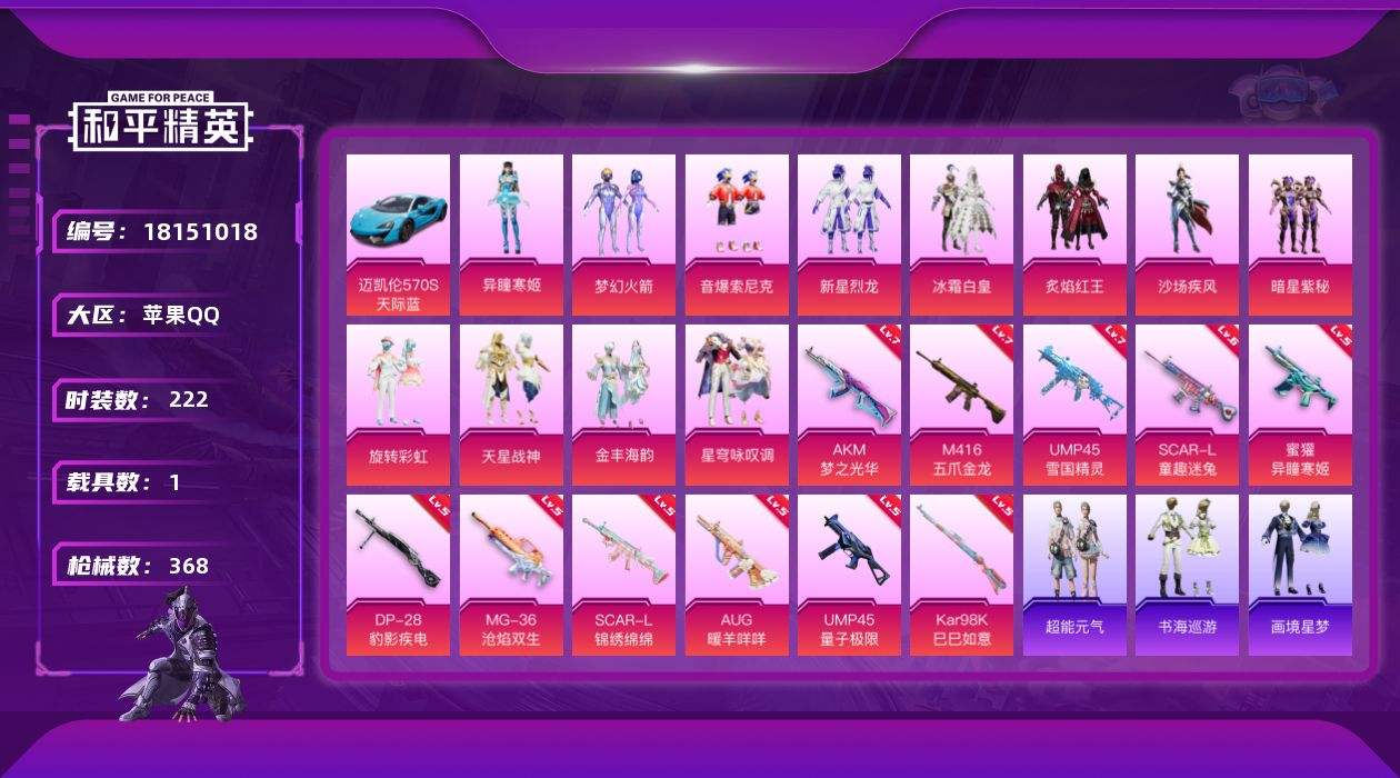 【625883】【可二次】【苹果QQ】UMP4雪国精灵 沙场疾风 暗星紫秘 梦幻火箭 M416-五爪金龙 AKM-梦之光华 新星烈龙 SCAR-童趣迷兔 迈凯伦570S 天际蓝