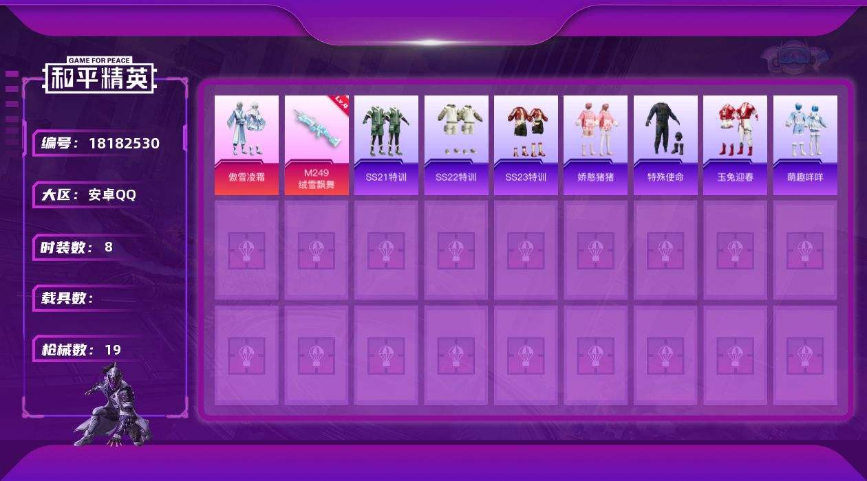 【630368】[18182530]安卓 手Q-1粉装-1特效枪-0载具-6059热力值-1印记-8套装-19枪皮【特效枪等级】:M249-绒雪飘舞(四级M249-绒雪飘舞)【优质套装】:粉装-傲雪凌霜【优质武器皮肤】:Kar98K-梦幻火箭,M249-绒雪飘舞【稀有武器皮肤】:AKM-彩虹符号,SCAR-L-玉兔迎春,Mk47-洛神天依,蜜獾-娇憨猪猪,UZI-娇憨猪猪,Vector-生命誓言
