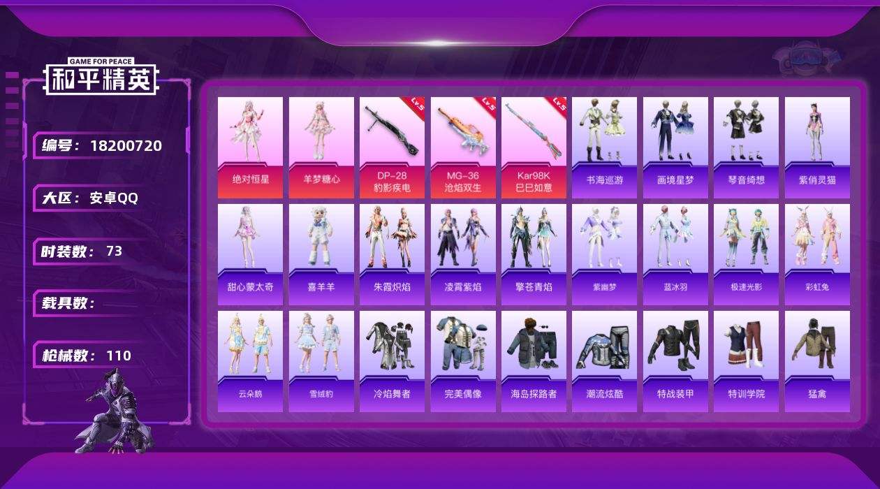 【632523】[18200720]安卓 手Q-2粉装-6特效枪-0载具-1粉色飞行器-29355热力值-6王牌印记-73套装-110枪皮【粉色套装】:角色-绝对恒星,角色-羊梦糖心【粉色枪皮等级】:UMP45-萌骑冒险(三级),AKS-74U-森灵之息(五级),Kar98K-巳巳如意(五级),Mk14-福马献瑞(五级),DP-28-豹影疾电(五级),MG-36-沧焰双生(五级)【粉色枪皮】:U