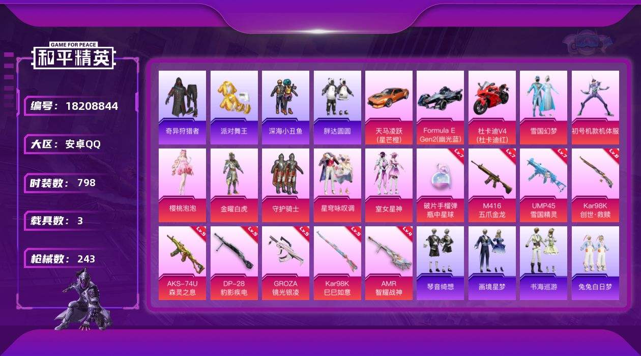 【633438】【不可二次】【安卓QQ】S686-奇异狩猎者 雪国梦幻 M416-五爪金龙 金曜白虎 漫步者 M24-奇异狩猎者 至尊龙雀飞行服 极速红龙 忍者信条 M762-奇异狩猎者 UMP4雪国精灵 仓鼠灰灰 M416-仓鼠灰灰 深海小丑鱼 浪漫天命 梦幻火箭飞行器 胖达圆圆 AKM-奇异狩猎者 Formula E Gen2(蓝) 奇异狩猎者 黑色刀锋 UMP45-雪国精灵 雪国幻梦 守护