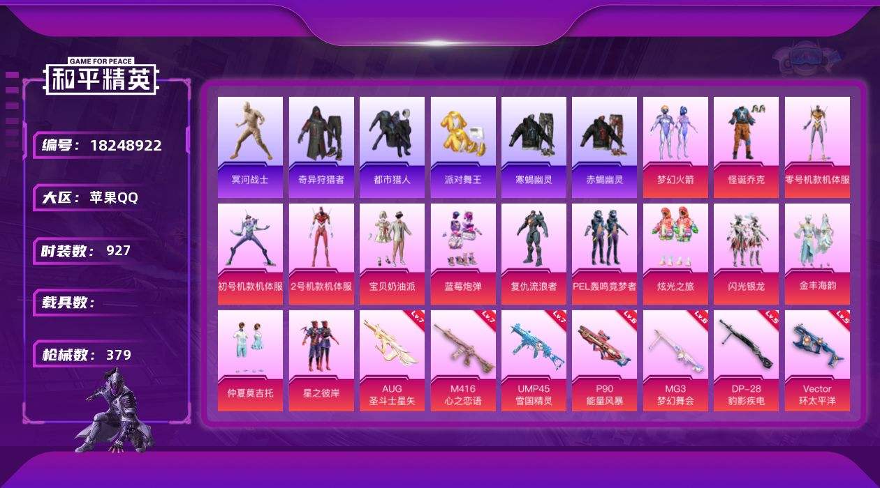 【638468】【可二次】【苹果QQ】龟仙人 都市猎人 梦起落英 寒蝎幽灵 M416-心之恋语 黄螳螂 AWM-黄金龙骨 MG3-梦幻舞会 王牌四分卫飞行器 怪诞乔克 M762-瑞龙福将 黑色刀锋 Vector-环太平洋 金羽特工 AKM-炫紫旋律 白月香洋装 红螳螂 蓝莓炮弹 木乃伊 M24-奇异狩猎者 机械英豪 极速红龙 赤蝎幽灵 M416-电玩时刻 UMP4雪国精灵 太空嘟嘟飞行器 星之彼