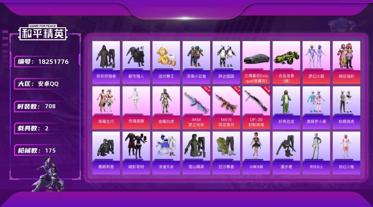 【638657】【不可二次】【安卓QQ】金曜白虎 漫步者 粉甜马卡龙 都市猎人 M24-奇异狩猎者 西部牛仔 极速红龙 豚鼠丹丹 缤纷油彩 深海小丑鱼 瑞龙福将 醒狮腾龙 浪漫天命 激萌罗小黑 胖达圆圆 团圆交子 软萌银虎 合金龙骨绿色 奇异狩猎者 M762-瑞龙福将 兰博轿车灰色 狂沙舞者 M416-风花雪月 梦幻火箭 AKM-梦之光华 AKM-缤纷海域 粉红小猪 金耀白虎 草莓生巧 派对舞王