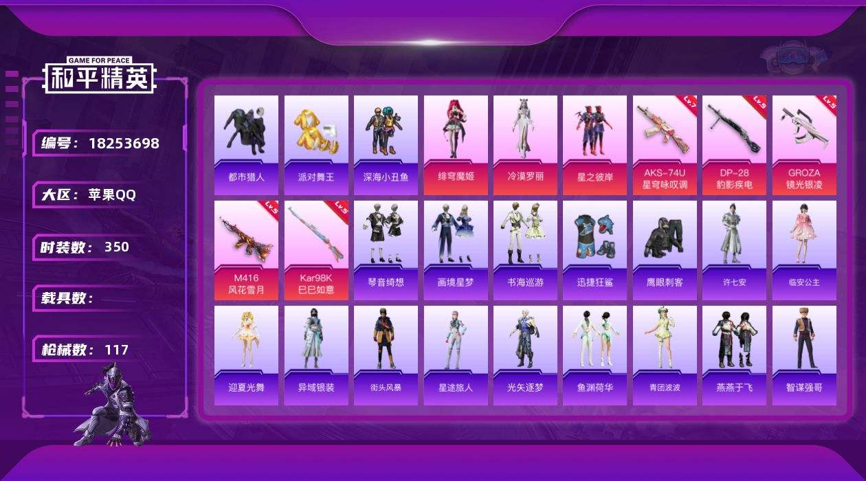 【638910】【可二次】【苹果QQ】水银刺客 M416-风花雪月 星之彼岸 漫步者 都市猎人 迅捷狂鲨 深海小丑鱼 派对舞王 极速红龙 镜光幻境飞行翼