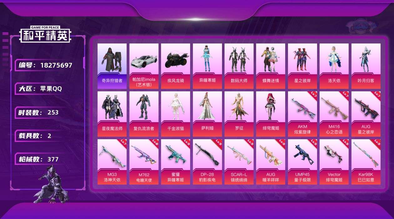 【641230】【不可二次】【苹果QQ】AKM-炫紫旋律 吟月归客 M416-心之恋语 奇异狩猎者 数码大师 浪漫波比 激萌小黄鸭 MG3-洛神天依 蝶舞迷情 洛天依 AUG-星之彼岸