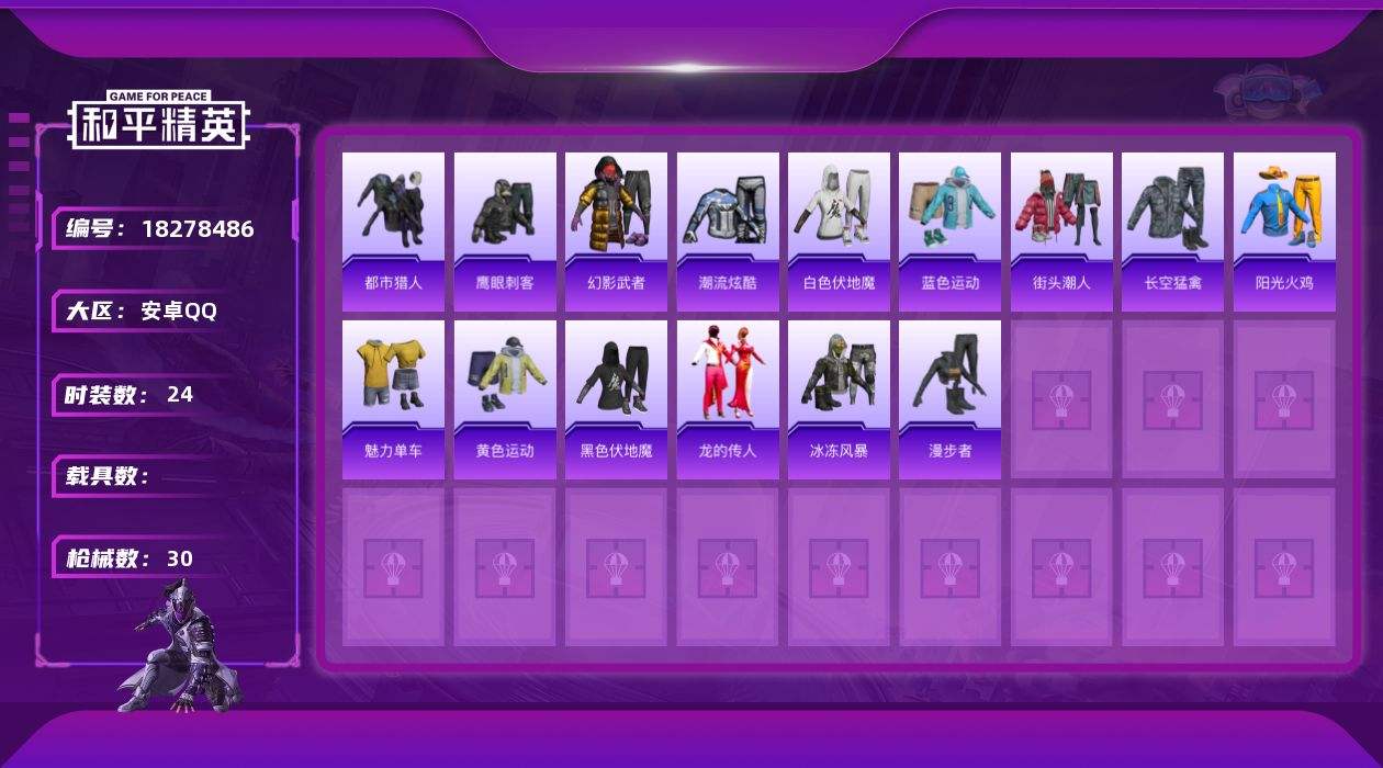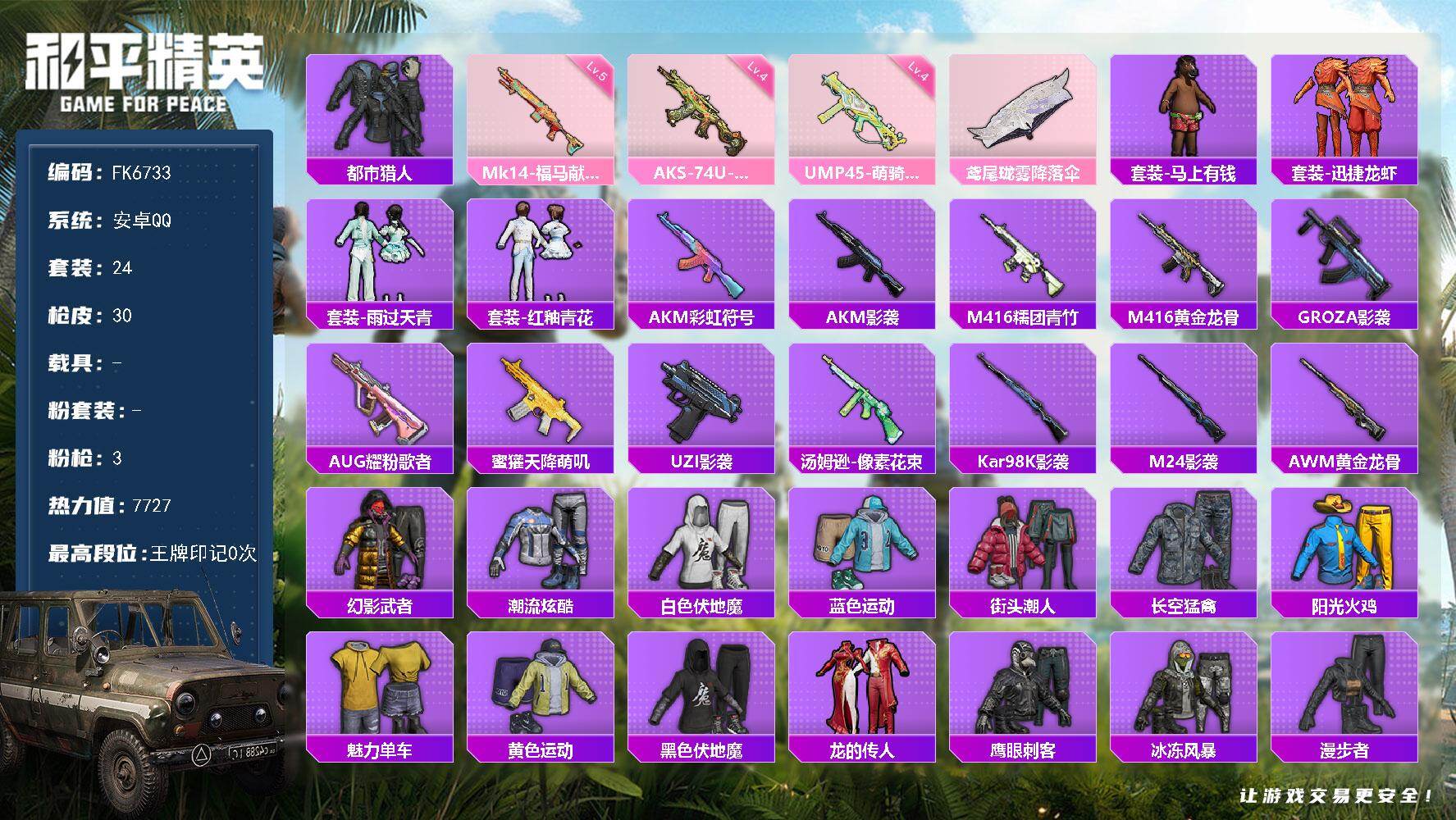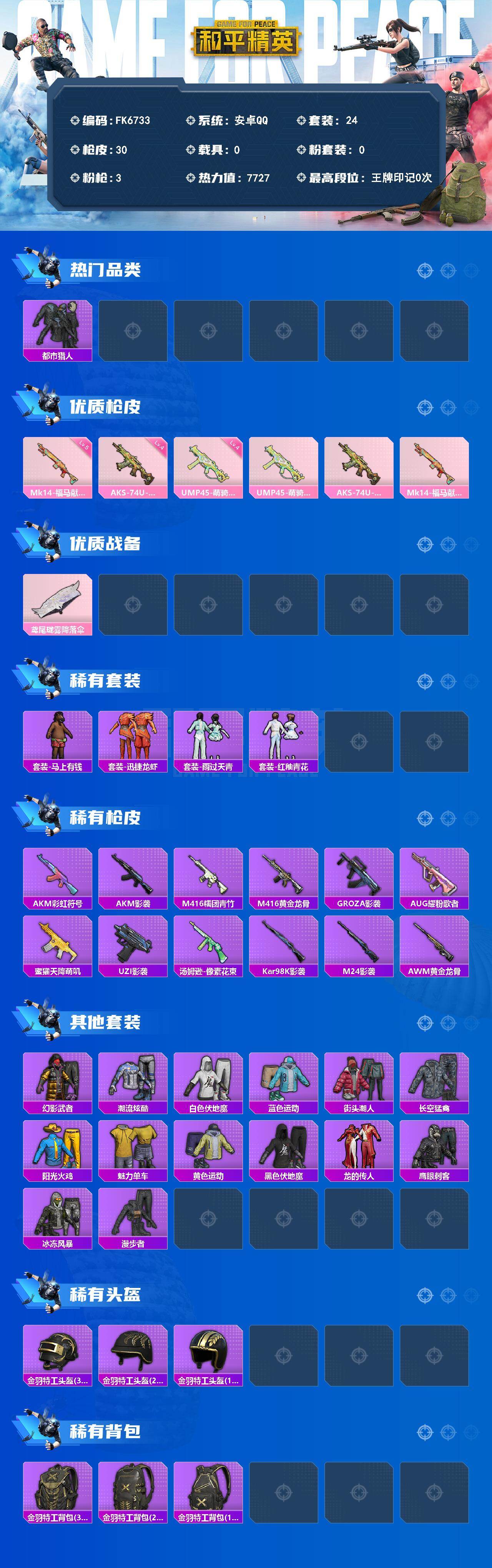 【641632】[18278486]【FK6733】24套装/枪械3/装备25/战备23/热力值7727/四级UMP45-萌骑冒险/四级AKS-74U-森灵之息/五级Mk14-福马献瑞/都市猎人/UMP45-萌骑冒险/AKS-74U-森灵之息/Mk14-福马献瑞/鸢尾珑雾降落伞/套装-马上有钱/套装-迅捷龙虾/套装-雨过天青/套装-红釉青花/AKM-彩虹符号/AKM-影袭/M416-糯团青竹/M