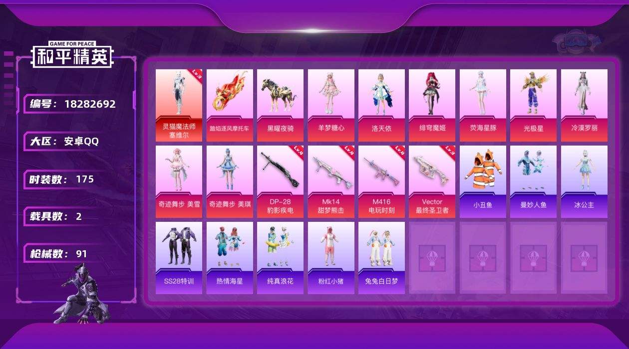 【642596】【不可二次】【安卓QQ】M416-电玩时刻 S686-奇异狩猎者 M24-奇异狩猎者 粉红小猪 灵猫魔法师-塞维尔 洛天依
