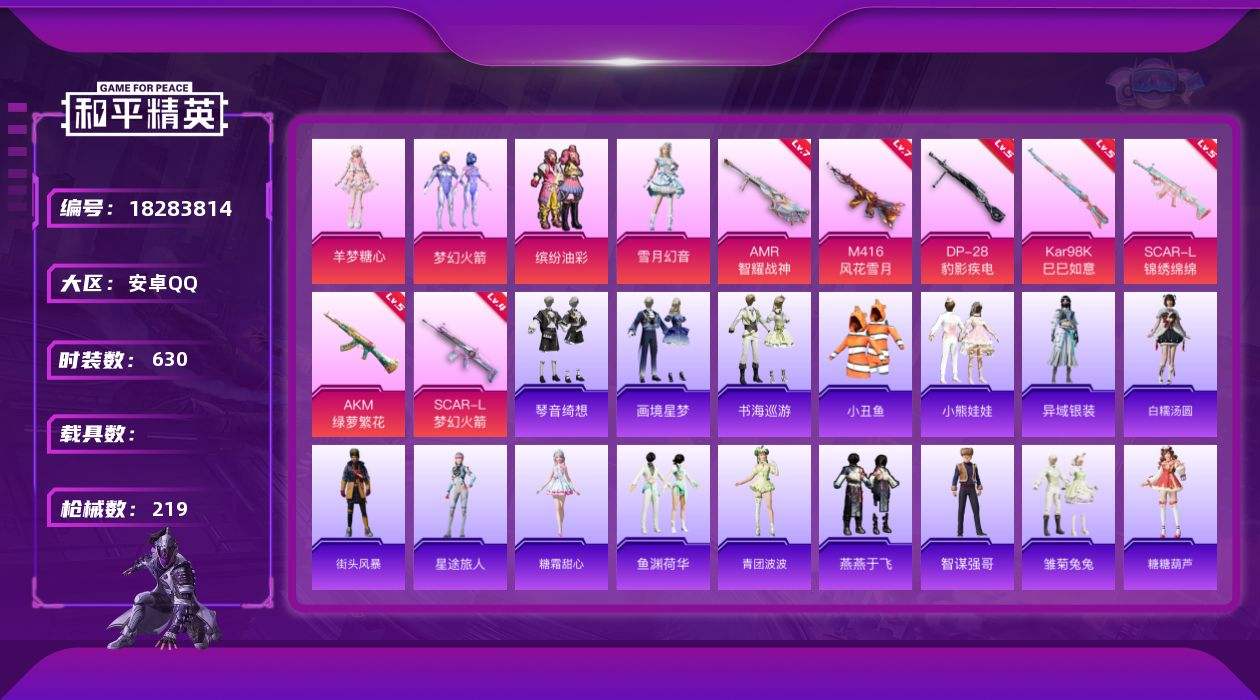 【642802】【不可二次】【安卓QQ】SCAR-L-梦幻火箭 龟仙人 AKM-绿萝繁花 漫步者 M762-瑞龙福将 SCAR-L梦幻火箭 潮萌小黄鸭 极速红龙 SCAR-L-锦绣绵绵 M416-风花雪月 梦幻火箭 AKM-缤纷海域 缤纷油彩 粉红小猪 瑞龙福将 激萌小黄鸭 团圆交子