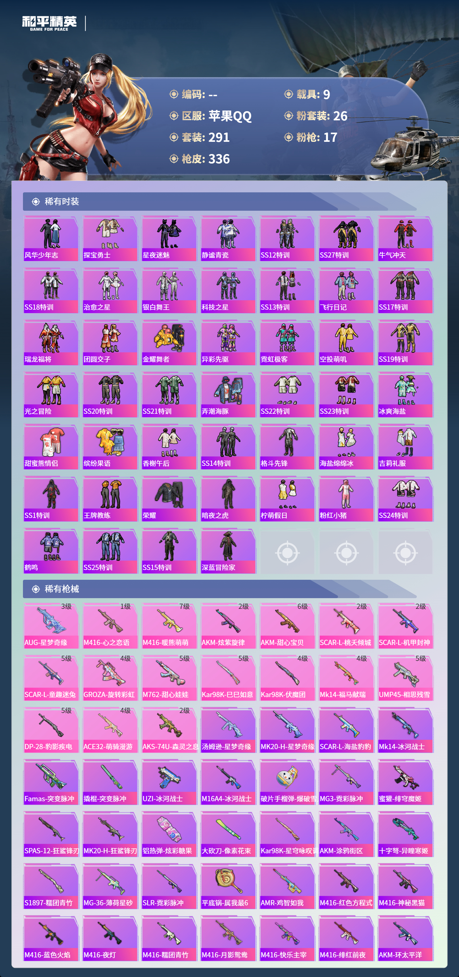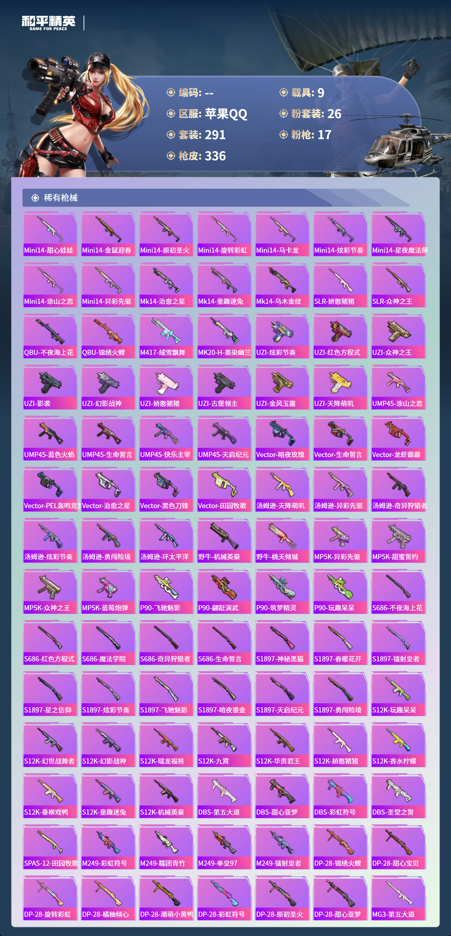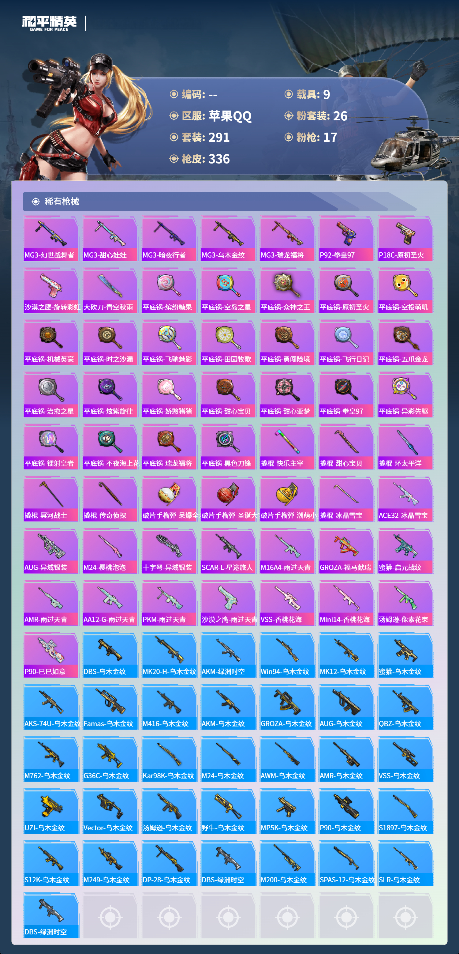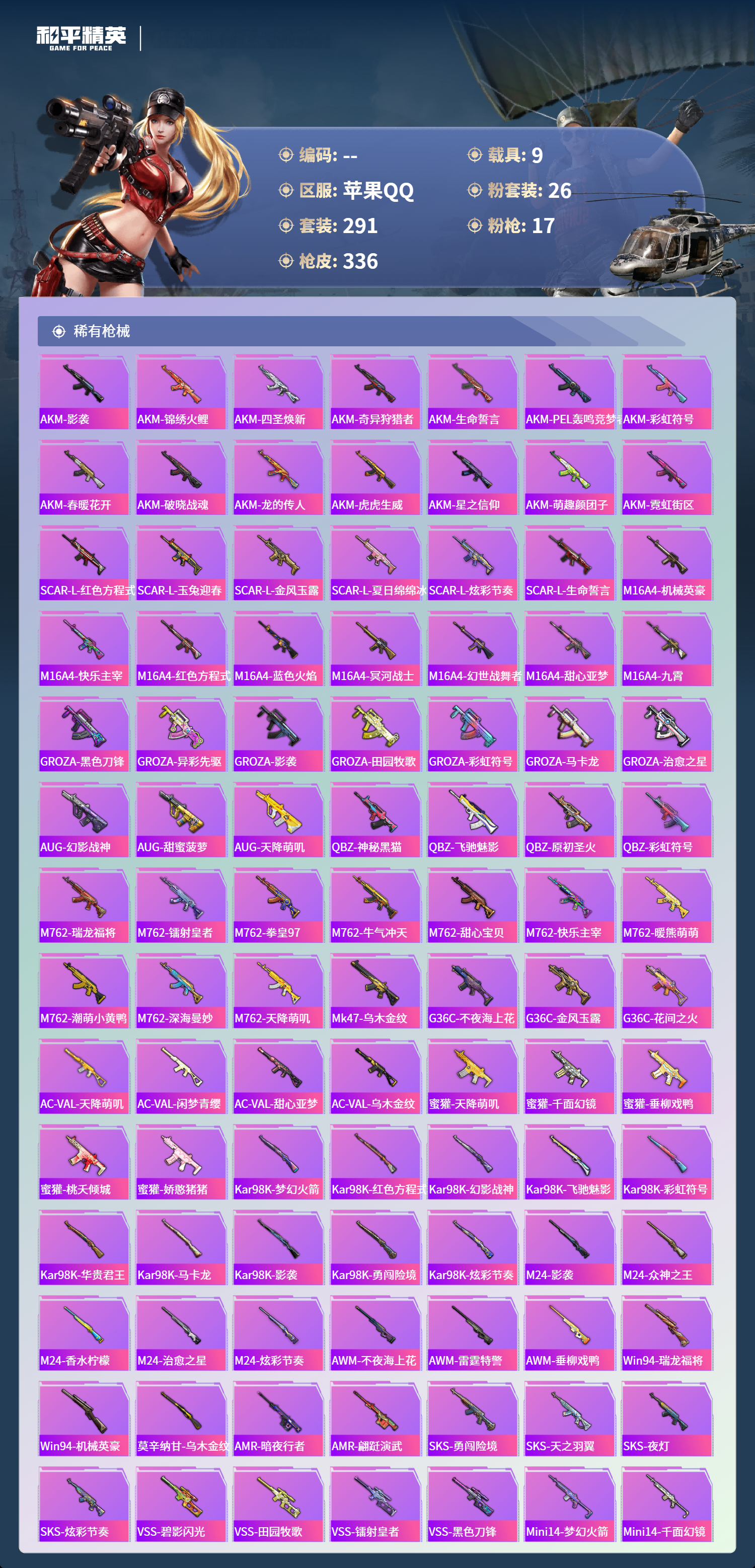 【645363】【不可二次】【苹果QQ】合金龙骨蓝色 路特斯EV紫色 龟仙人 焰龙咆哮 大橘为重 漫步者 花间之火 都市猎人 娴静芝兰 AUG-星梦奇缘 M416-暖熊萌萌 M416-心之恋语 缤纷油彩 SCAR-童趣迷兔 GROZA-旋转彩虹 Kar98K-伏魔团 AKM-甜心宝贝 纯白誓言 AKM-奇异狩猎者 星之信仰 SS1特训 合金龙骨红色 怪诞乔克 M762-瑞龙福将 潮萌小黄鸭 黑色