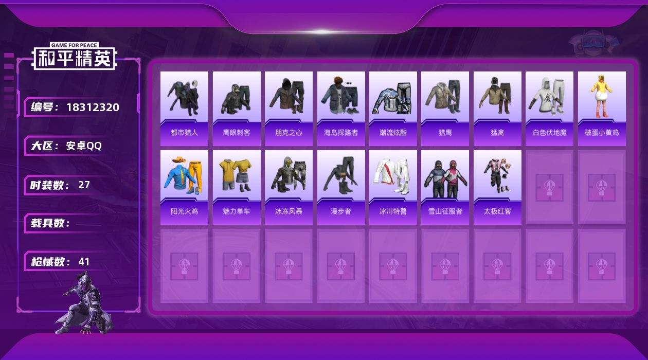 【646026】[18312320]【FK6671】27套装/枪械2/装备28/战备31/王牌印记1/热力值8507/四级UMP45-萌骑冒险/三级Mk14-福马献瑞/都市猎人/UMP45-萌骑冒险/Mk14-福马献瑞/幻影战神降落伞/罪夜之冕降落伞/套装-雪国风尚/角色-幸运青/套装-马上来财/套装-雨过天青/套装-红釉青花/AKM-彩虹符号/AKM-影袭/SCAR-L-炫彩节奏/M416-糯