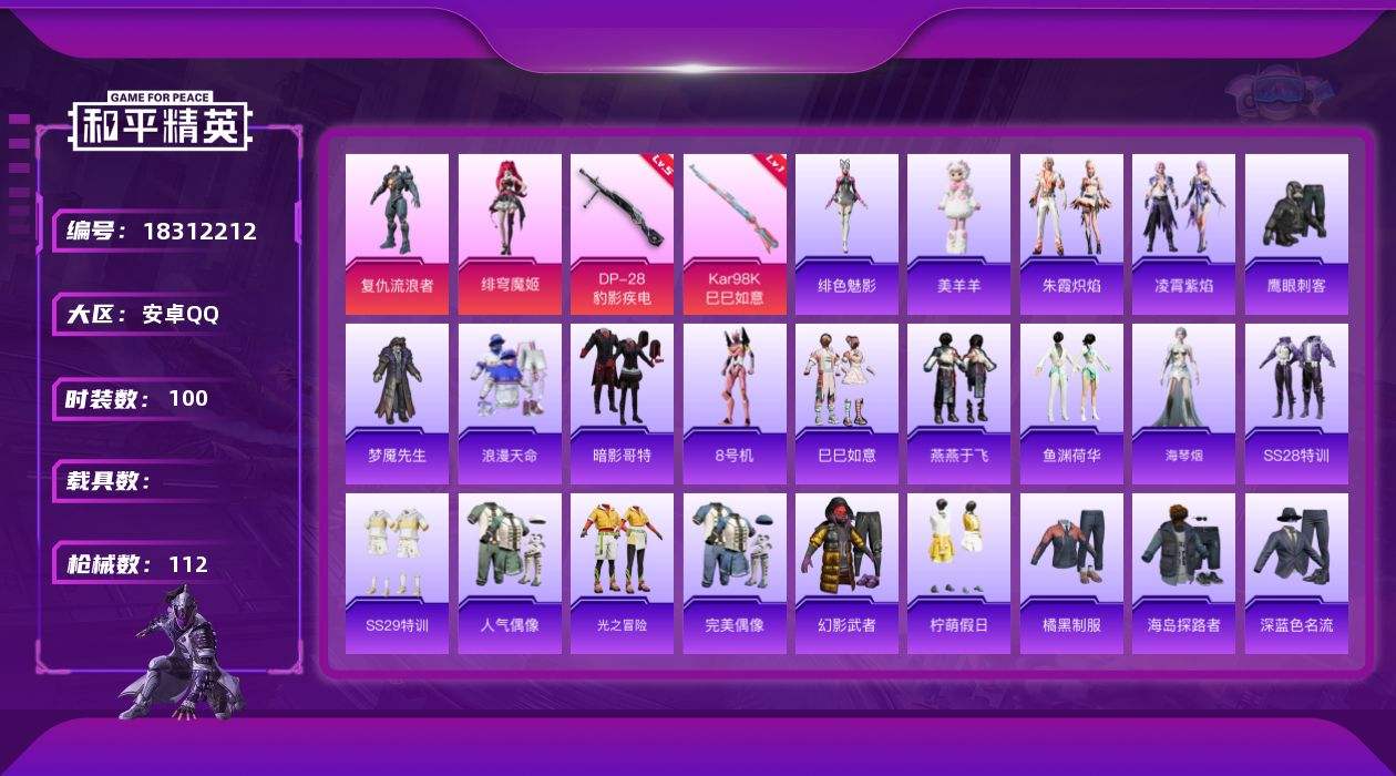 【646096】[18312212]安卓 手Q-2粉装-4特效枪-0载具-0粉色飞行器-28179热力值-1王牌印记-100套装-112枪皮【热门品类】:套装-浪漫天命,套装-暗影哥特,角色-8号机【粉色套装】:角色-复仇流浪者,角色-绯穹魔姬【粉色枪皮等级】:ACE32-萌骑漫游(五级),Kar98K-巳巳如意(一级),Mk14-福马献瑞(四级),DP-28-豹影疾电(五级)【粉色枪皮】:AC