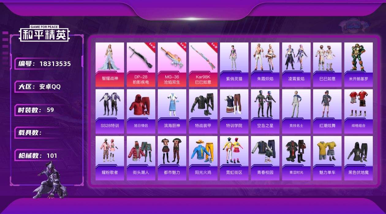 【646125】[18313535]安卓 手Q-1粉装-6特效枪-0载具-1粉色飞行器-24392热力值-1王牌印记-59套装-101枪皮【粉色套装】:角色-智耀战神【粉色枪皮等级】:AKS-74U-森灵之息(五级),Kar98K-巳巳如意(五级),Mk14-福马献瑞(五级),AA12-G-萌骑幻想(三级),DP-28-豹影疾电(五级),MG-36-沧焰双生(五级)【粉色枪皮】:AKS-74U-