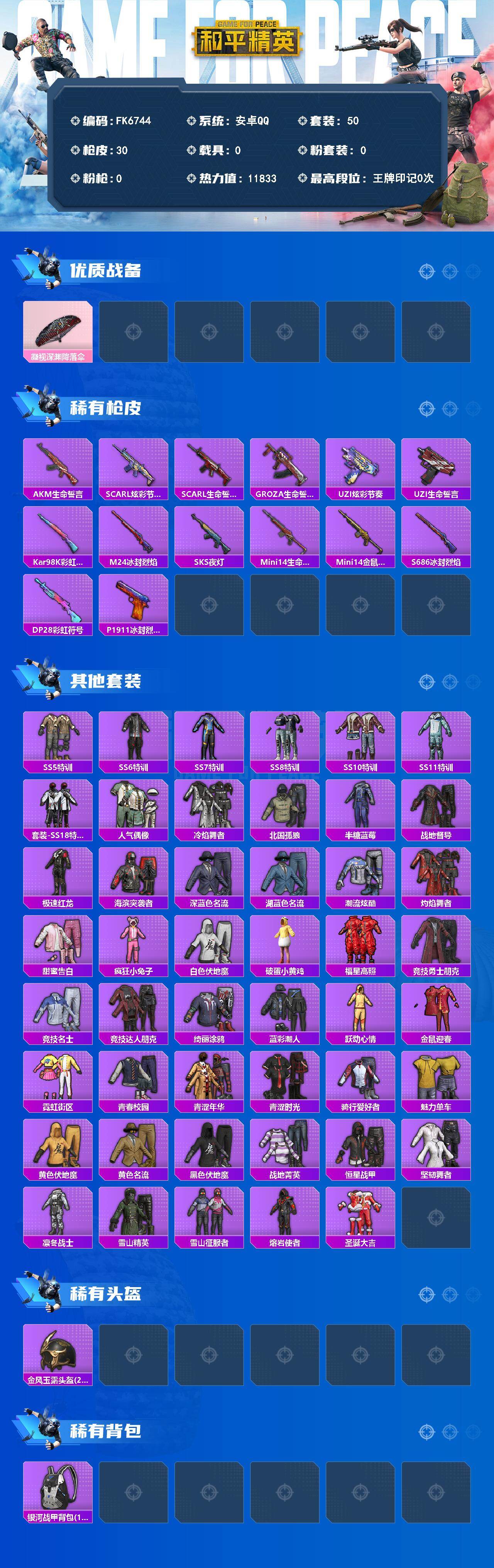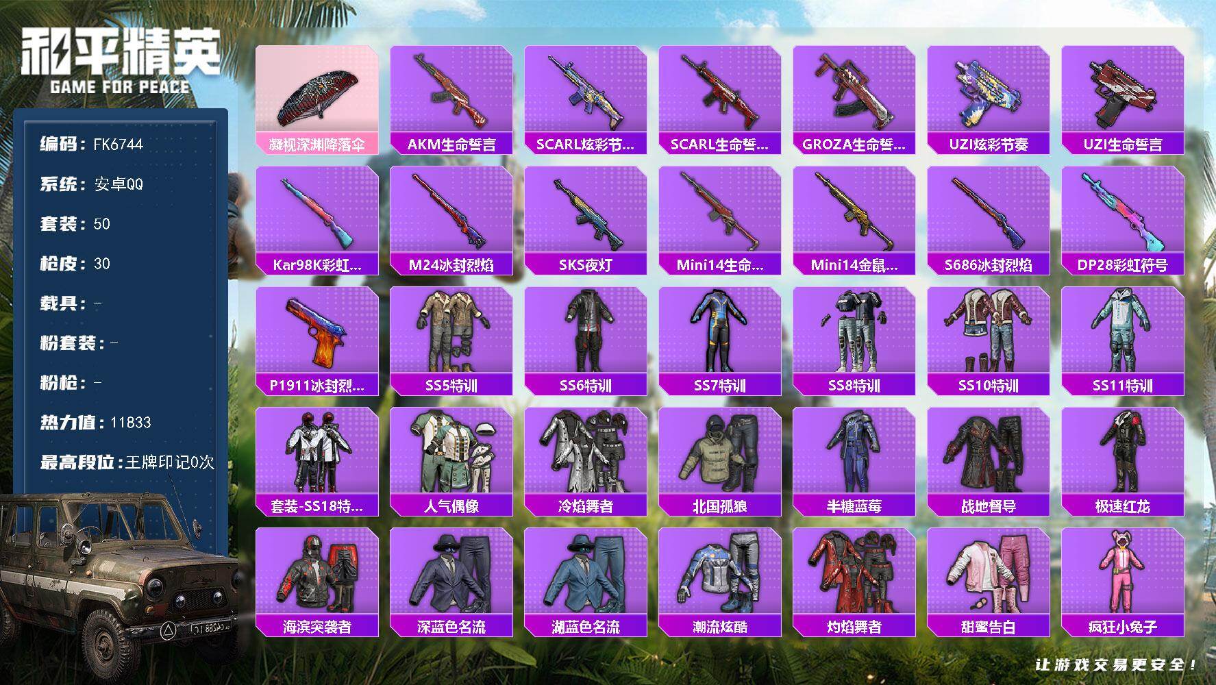 【646324】[18313107]【FK6744】50套装/装备35/战备51/热力值11833/凝视深渊降落伞/AKM-生命誓言/SCAR-L-炫彩节奏/SCAR-L-生命誓言/GROZA-生命誓言/UZI-炫彩节奏/UZI-生命誓言/Kar98K-彩虹符号/M24-冰封烈焰/SKS-夜灯/Mini14-生命誓言/Mini14-金鼠迎春/S686-冰封烈焰/DP-28-彩虹符号/P1911-