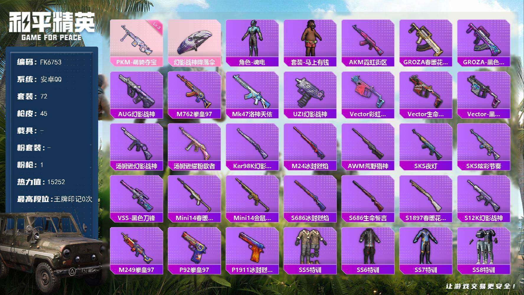 【646855】【可二次】【安卓QQ】AUG幻影战神 霓虹街区降落伞 沙场雄鹰降落伞 黑色刀锋 幻影战神降落伞 丛林猎人降落伞 冰封烈焰降落伞 都市猎人降落伞 UZI幻影战神 钢铁雄心降落伞 马戏团糖果降落伞 化学天才降落伞 牛气冲天降落伞 放飞梦想降落伞 白昼之火降落伞 幻影公爵 Kar98K幻影战神 雪山精英 醒狮欢腾降落伞 黑色刀锋降落伞 金鼠迎春降落伞