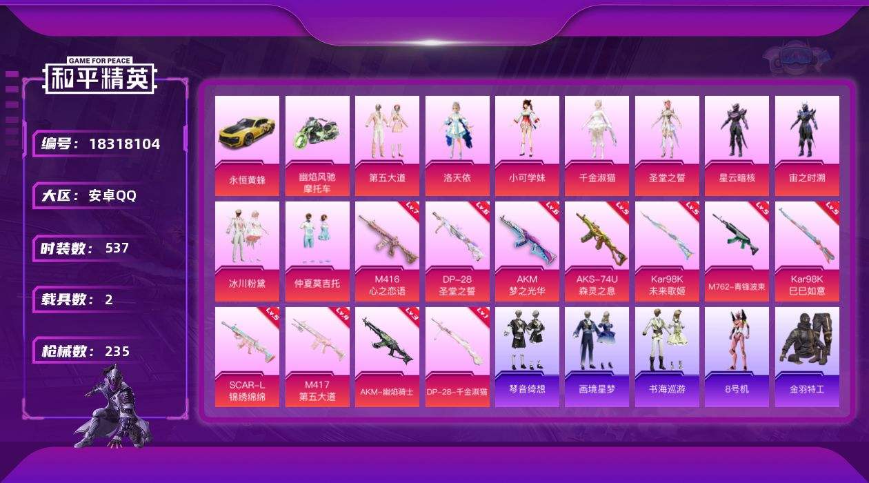 【647008】【不可二次】【安卓QQ】软萌银虎 龟仙人 M762-青锋波束 漫步者 DP-28-圣堂之誓 洛天依 M417射手步枪 Kar98k-未来歌姬 SCAR-L-锦绣绵绵 AKM-梦之光华 M416-心之恋语 永恒黄蜂 M417-第五大道