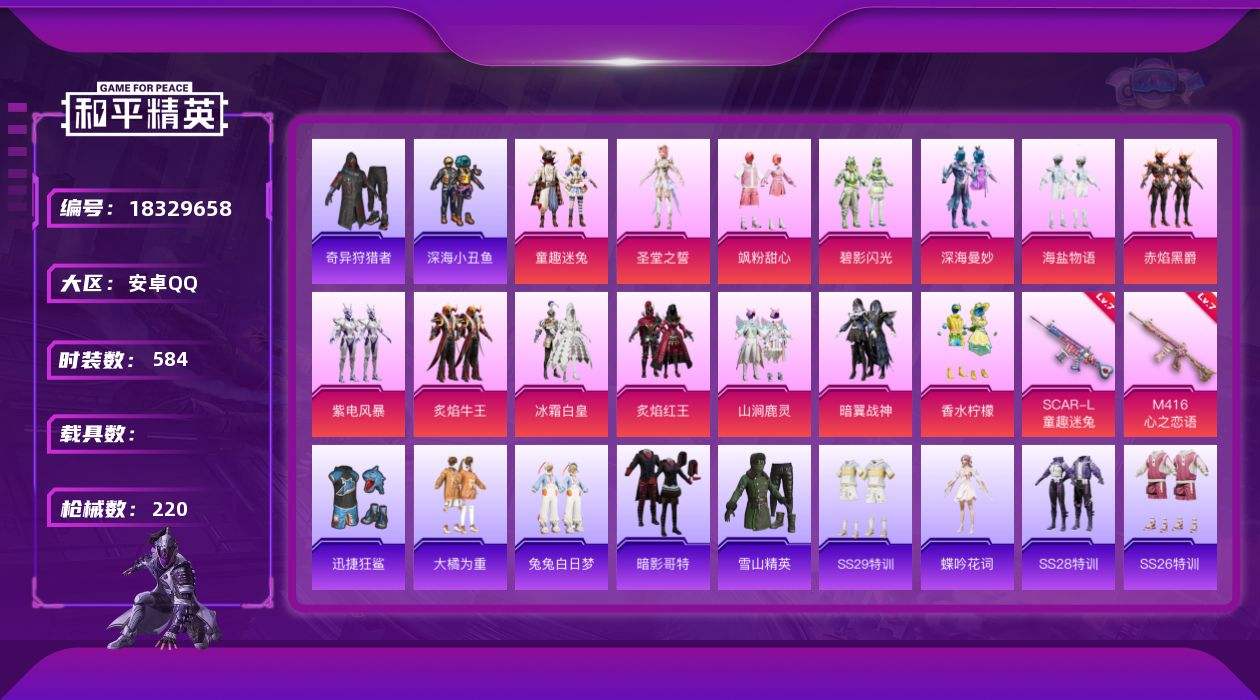 【648561】【不可二次】【安卓QQ】龟仙人 暗翼战神 大橘为重 炙焰红王 韶华初心 汤姆逊-林间仙鹿 Mini14-林间仙鹿 赤焰黑爵 海盐物语 M416-仓鼠灰灰 GROZA-林间仙鹿 M416-心之恋语 深海小丑鱼 山涧鹿灵 碧影闪光 SCAR-童趣迷兔 童趣迷兔 瑞龙福将 醒狮腾龙 团圆交子 紫电风暴 深海曼妙 迅捷狂鲨 奇异狩猎者 M762-瑞龙福将 黑色刀锋 新侠客行 香水柠檬 终