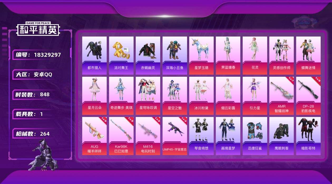 【648647】【不可二次】【安卓QQ】龟仙人 星梦玉骢 漫步者 都市猎人 迅捷狂鲨 UMP45-宇宙意志 赤蝎幽灵 M416-电玩时刻 糯粉咩咩 星空之魅 AKM-缤纷海域 深海小丑鱼 派对舞王 蝶舞迷情 软软马卡龙 浪漫天命 暗影哥特 雪山精英 纯白誓言