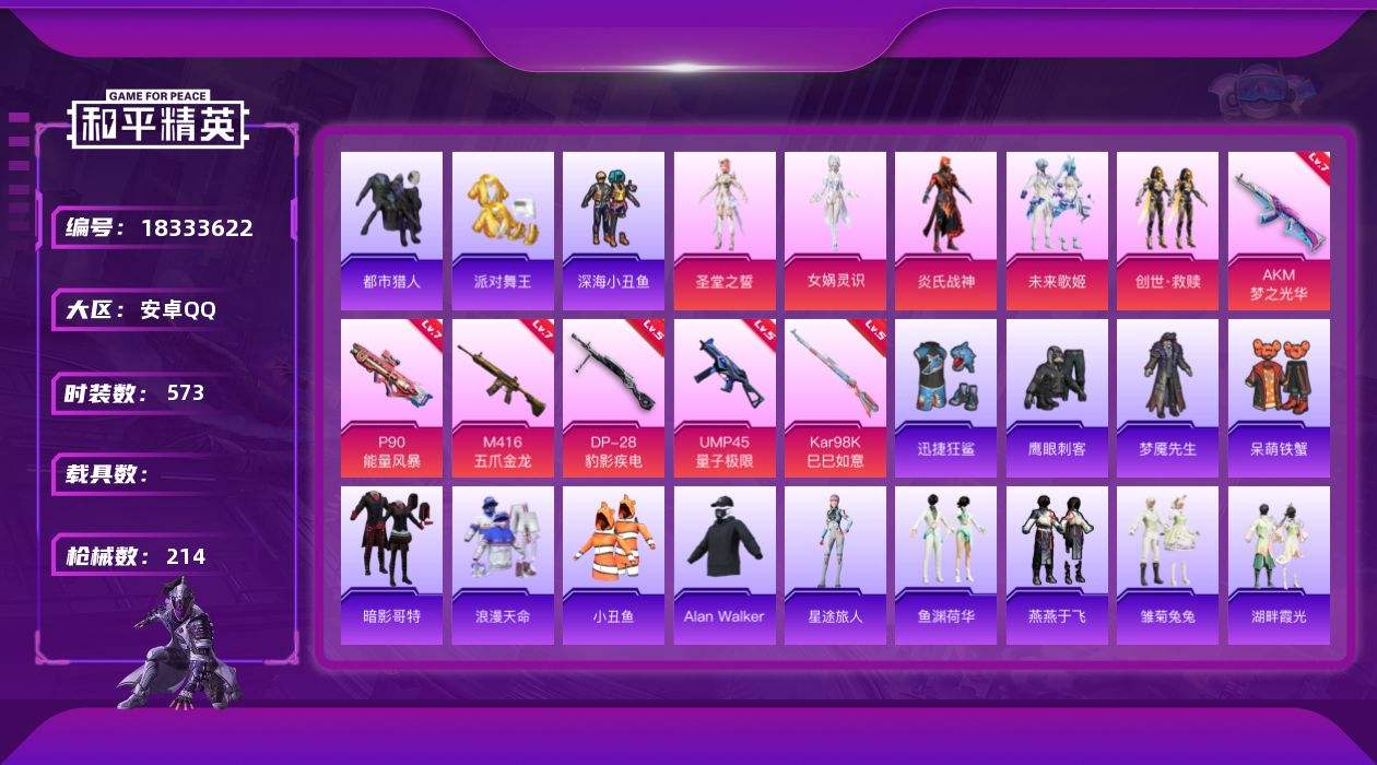 【649012】【可二次】【安卓QQ】龟仙人 P90-能量风暴 M416-五爪金龙 漫步者 都市猎人 迅捷狂鲨 M24-奇异狩猎者 M762-瑞龙福将 太空嘟嘟飞行器 UMP45-量子极限 AKM-梦之光华 AKM-缤纷海域 深海小丑鱼 瑞龙福将 派对舞王 浪漫天命 暗影哥特 团圆交子