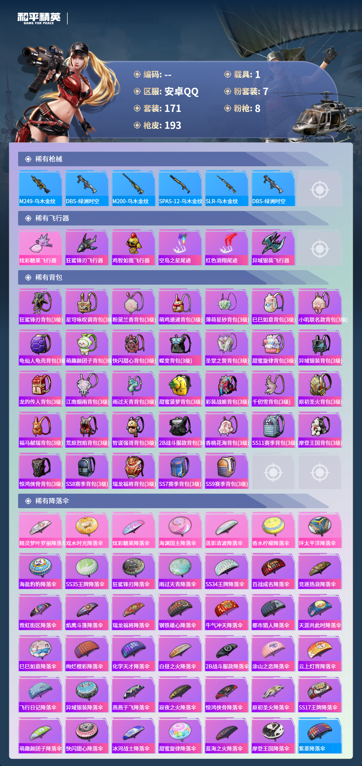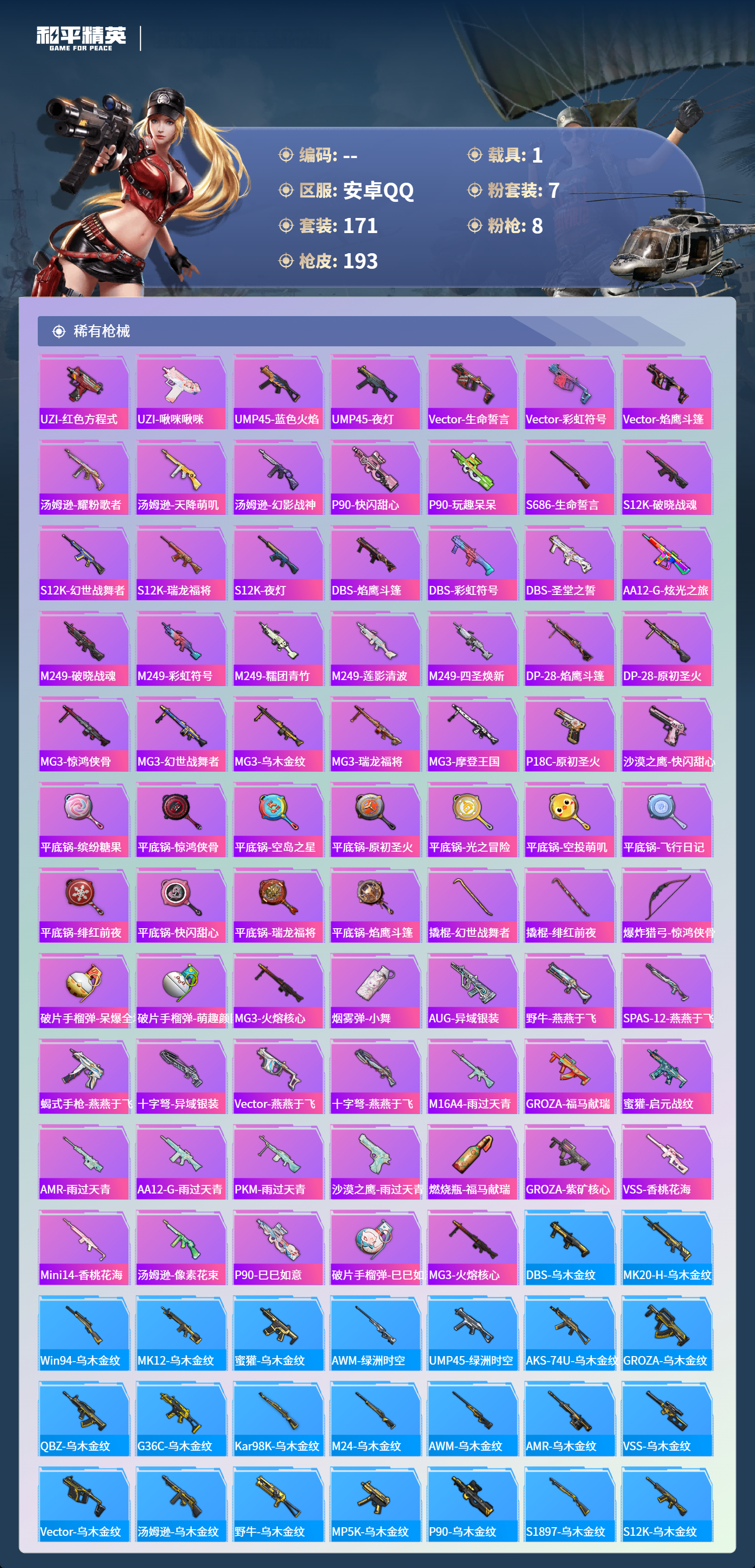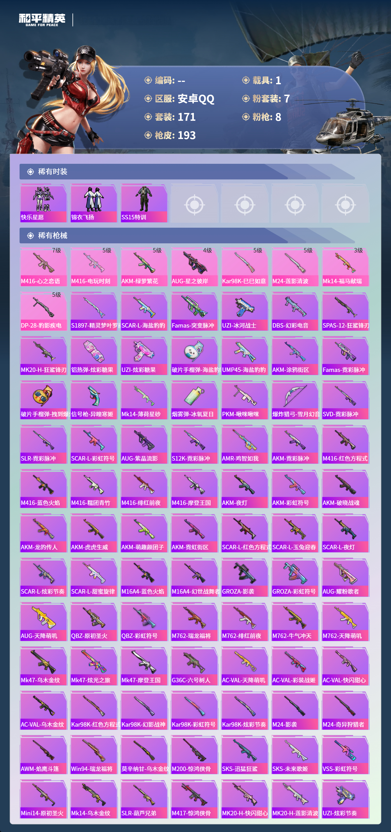 【650125】【可二次】【安卓QQ】龟仙人 AKM-绿萝繁花 M24-莲影清波 绚金战神 M24-奇异狩猎者 M762-瑞龙福将 极速红龙 M416-电玩时刻 放客神游 M416-心之恋语 粉红小猪 瑞龙福将 风华少年志 AUG-星之彼岸 团圆交子