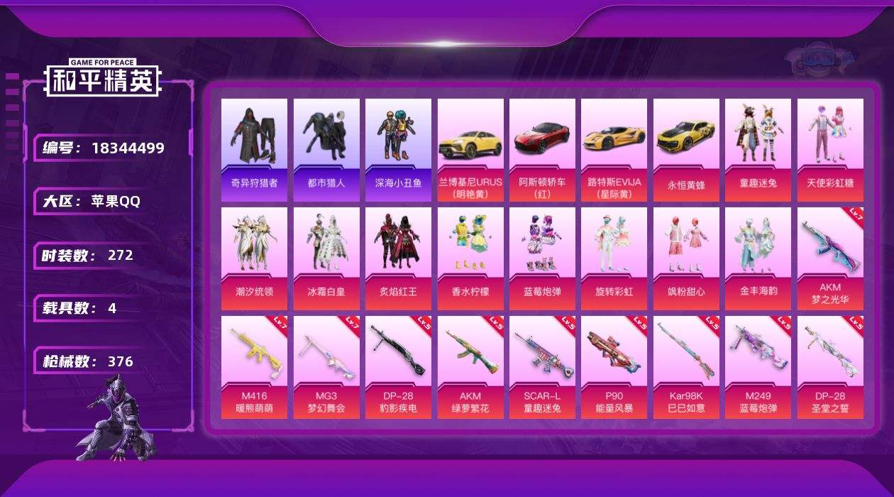 【650345】【可二次】【苹果QQ】蓝莓炮弹 潮汐统领 路特斯EV黄色 奇异狩猎者 兰博SUV黄色 AKM-炫紫旋律 AKM-梦之光华 M416-心之恋语 阿斯顿马丁S红色 天使彩虹糖 M249-蓝莓炮弹 深海小丑鱼 SCAR-童趣迷兔