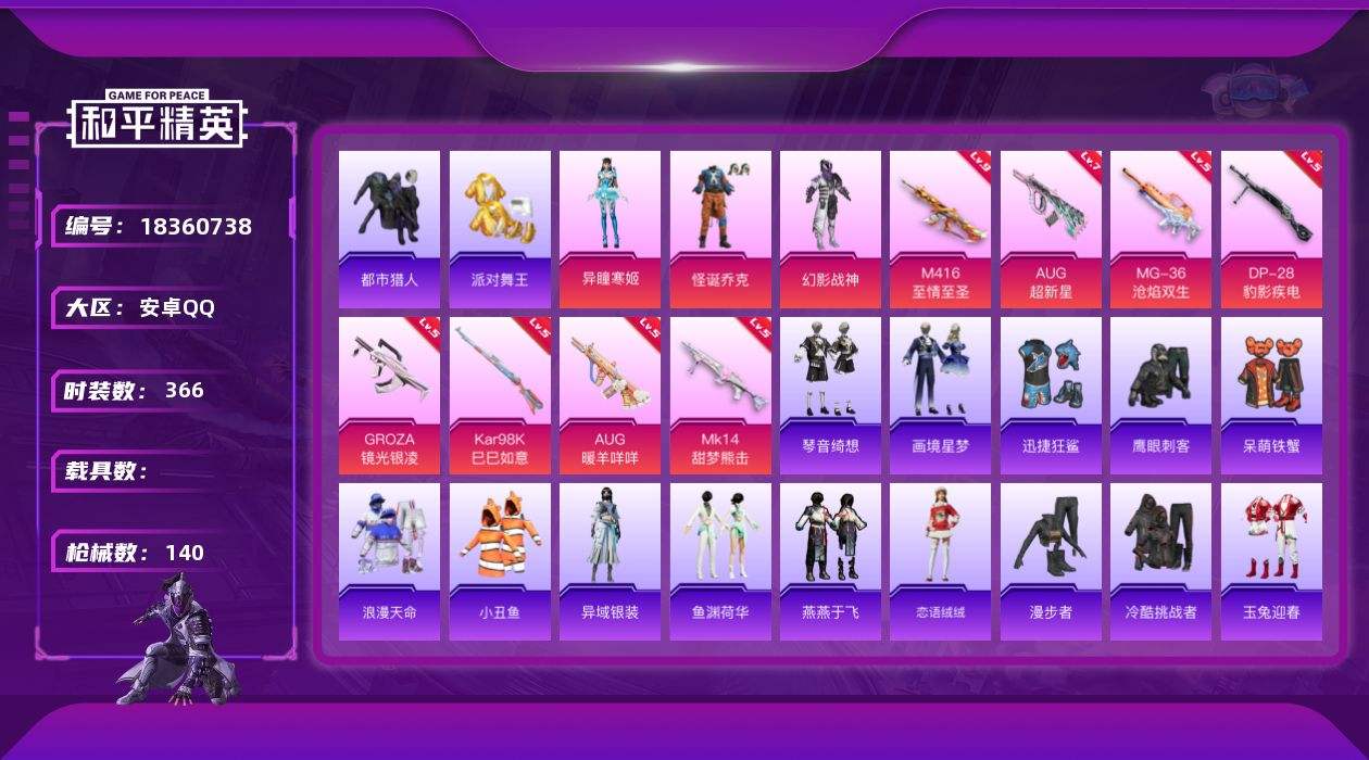 【652581】【不可二次】【安卓QQ】M416-至情至圣 水银刺客 漫步者 怪诞乔克 都市猎人 迅捷狂鲨 AUG-超新星 幻影战神 派对舞王 浪漫天命 忍者信条
