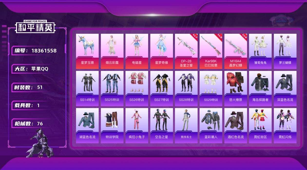 【652679】[18361558]【FK6010】51套装/枪械3/装备106/载具1/战备66/王牌印记6/热力值23509/四级M16A4-晶梦幻蝶/五级Kar98K-巳巳如意/七级DP-28-圣堂之誓/大砍刀-青龙偃月刀/烟云彩露/电磁星/星梦奇缘/星梦玉骢/M16A4-晶梦幻蝶/Kar98K-巳巳如意/DP-28圣堂之誓/绝色倾城飞行器/潮汐统领降落伞/洛神天依降落伞/圣堂之誓降落伞/